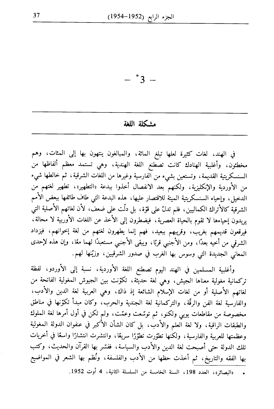 في الهند، لغات كثيرة لعلها تبلغ المائة، والمبالغون ينتهون بها إلى المئات، وهم مخطئون، وأغلبية الهنادك كانت تصطنع اللغة الهندية، وهي تستمد معظم ألفاظها من السنسكريتية القديمة، وتستعين بشيء من الفارسية وغيرها من اللغات الشرقية، ثم خالطها شيء من الأوردية والإنكليزية، ولكنهم بعد الانفصال أخذوا ببدعة "التطهير"، تطهير لغتهم من الدخيل، وإحياء السنسكريتية الميتة للاقتصار عليها، هذه البدعة التي طاف طائفها ببعض الأمم الشرقية كالأتراك الكماليين، فلم تدلّ على قوّة، بل دلّت على ضعف، لأن لغاتهم الأصلية التي يريدون إحياءها لا تقوم بالحياة العصرية، فيضطرون إلى الأخذ عن اللغات الأوربية لا محالة، فيرقعون قديمهم بغريب، وقريبهم ببعيد، فهم إنما يطهرون لغتهم من لغة إخوانهم، فيزداد الشرقي من أخيه بعدًا، ومن الأجنبي قربًا، ويبقى الأجنبي مستعبدًا لهما معًا، وإن هذه لإحدى المعاني الجديدة التي وسوس بها الغرب في صدور الشرقيين، وزيّنها لهم.