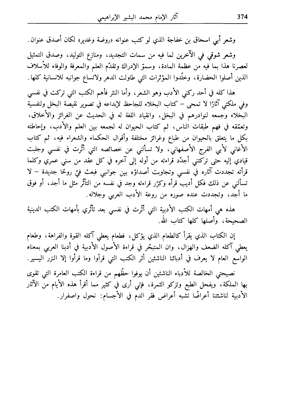 هذا كله في أحد ركني الأدب وهو الشعر، وأما النثر فأهم الكتب التي تركت في نفسي وفي ملكتي آثارًا لا تمحى- كتاب البخلاء للجاحظ لإبداعه في تصوير نقيصة البخل ولنفسية البخلاء وجمعه لنوادرهم في البخل، وانقياد اللغة له في الحديث عن الغرائز والأخلاق، وتعمّقه في فهم طبقات الناس، ثم كتاب الحيوان له لجمعه بين العلم والأدب، وإحاطته بكل ما يتعلق بالحيوان من طباع وغرائز مختلفة وأقوال الحكماء والشعراء فيه، ثم كتاب الأغاني لأبي الفرج الأصفهاني، ولا تسألني عن خصائصه التي أثرت في نفسي وجلبت قيادي إليه حتى تركتني أجدّد قراءته من أوله إلى آخره في كل عقد من سني عمري وكلما قرأته تجددت آثاره في نفسي وتجاوبت أصداؤه بين جوانبي فبعث فيّ روحًا جديدة- لا تسألني عن ذلك فكل أديب قرأه وكرّر قراءته وجد في نفسه من التأثّر مثل ما أجد، أو فوق ما أجد، وتجددت عنده صوره من روعة الأدب العربي وجلاله.