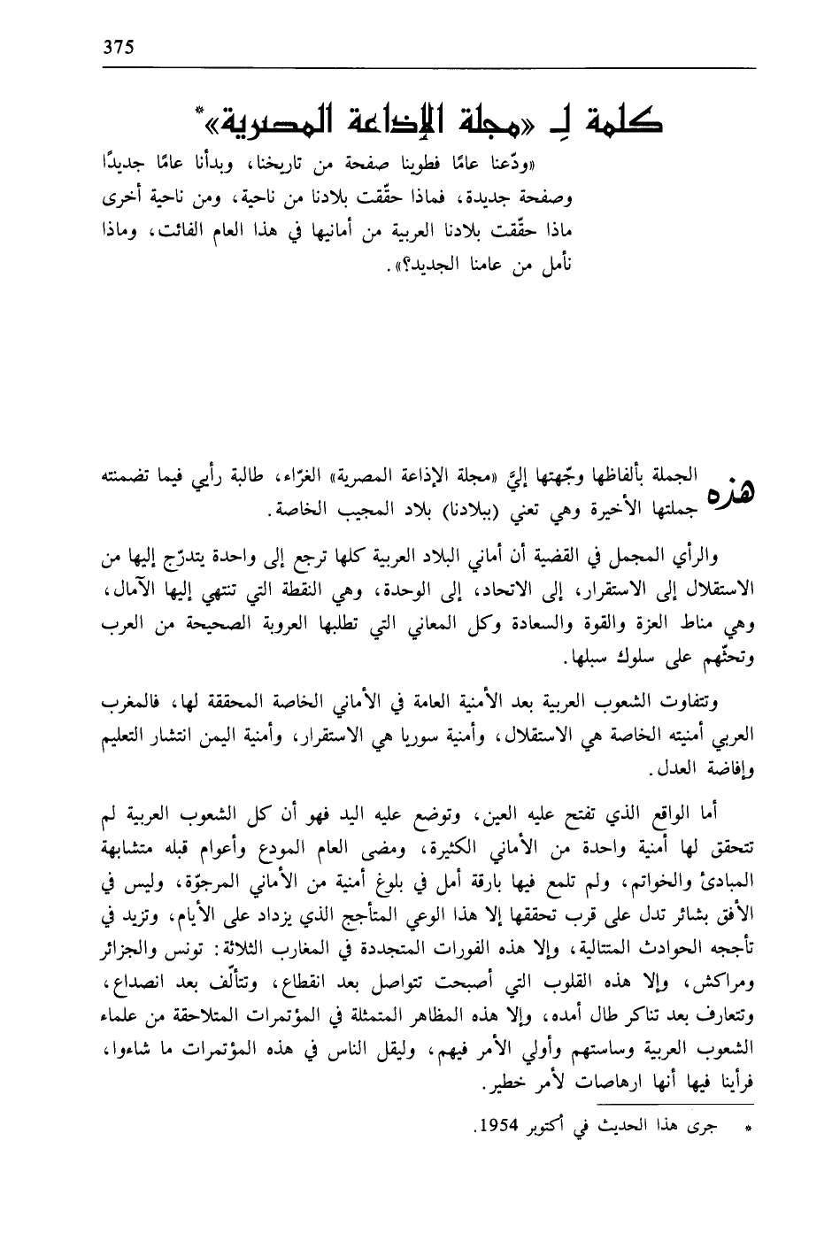 "ودّعنا عامًا فطوينا صفحة من تاريخنا، وبدأنا عامًا جديدًا وصفحة جديدة، فماذا حقّقت بلادنا من ناحية، ومن ناحية أخرى ماذا حقّقت بلادنا العربية من أمانيها في هذا العام الفائت، وماذا نأمل من عامنا الجديد؟ ".