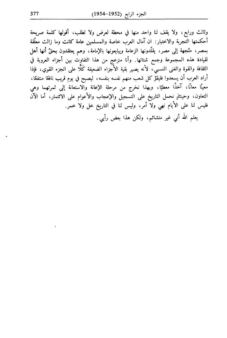 وثالث ورابع، ولا يقف لنا واحد منها في محطة لعرض ولا لطلب، أقولها كلمة صريحة أحكمتها التجربة والاختبار: إن آمال العرب خاصة والمسلمين عامة كانت وما زالت معلّقة بمصر، متّجهة إلى مصر، يقلّدونها الزعامة ويبايعونها بالإمامة، وهم يعتقدون بحق أنها أهل لقيادة هذه المجموعة وجمع شتاتها. وأنا منزعج من هذا التفاوت بين أجزاء العروبة في الثقافة والقوة والغنى النسبي، لأنه يصير بقية الأجزاء الضعيفة كَلًّا على الجزء القوي، فإذا أراد العرب أن يسعدوا فليقوِّ كل شعب منهم نفسه بنفسه، ليصبح في يوم قريب نافعًا منتفعًا، معينًا معانًا، آخذًا معطيًا، وبهذا نخرج من مرحلة الإعانة والاستعانة إلى ثمرتهما وهي التعاون، وحينئذٍ نحمل التاريخ على التسجيل والإعجاب والأعوام على الائتمار، أما الآن فليس لنا على الأيام نهي ولا أمر، وليس لنا في التاريخ خل ولا خمر.