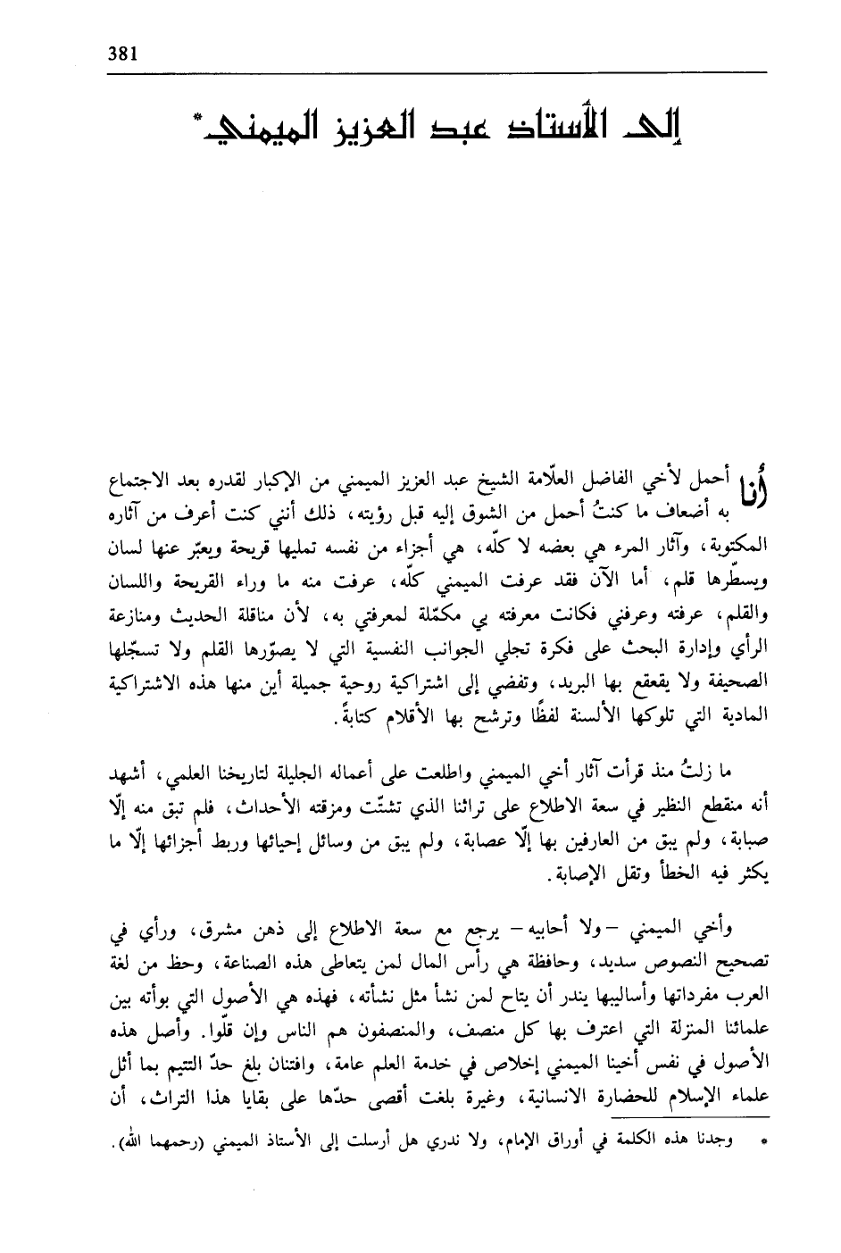 أنا أحمل لأخي الفاضل العلّامة الشيخ عبد العزيز الميمني من الإكبار لقدره بعد الاجتماع به أضعاف ما كنتُ أحمل من الشوق إليه قبل رؤيته، ذلك أنني كنت أعرف من آثاره المكتوبة، وآثار المرء هي بعضه لا كلّه، هي أجزاء من نفسه تمليها قريحة ويعبّر عنها لسان ويسطّرها قلم، أما الآن فقد عرفت الميمني كلّه، عرفت منه ما وراء القريحة واللسان والقلم، عرفته وعرفني فكانت معرفته بي مكمّلة لمعرفتي به، لأن مناقلة الحديث ومنازعة الرأي وإدارة البحث على فكرة تجلي الجوانب النفسية التي لا يصوّرها القلم ولا تسجّلها الصحيفة ولا يقعقع بها البريد، وتفضي إلى اشتراكية روحية جميلة أين منها هذه الاشتراكية المادية التي تلوكها الألسنة لفظًا وترشح بها الأقلام كتابةً.