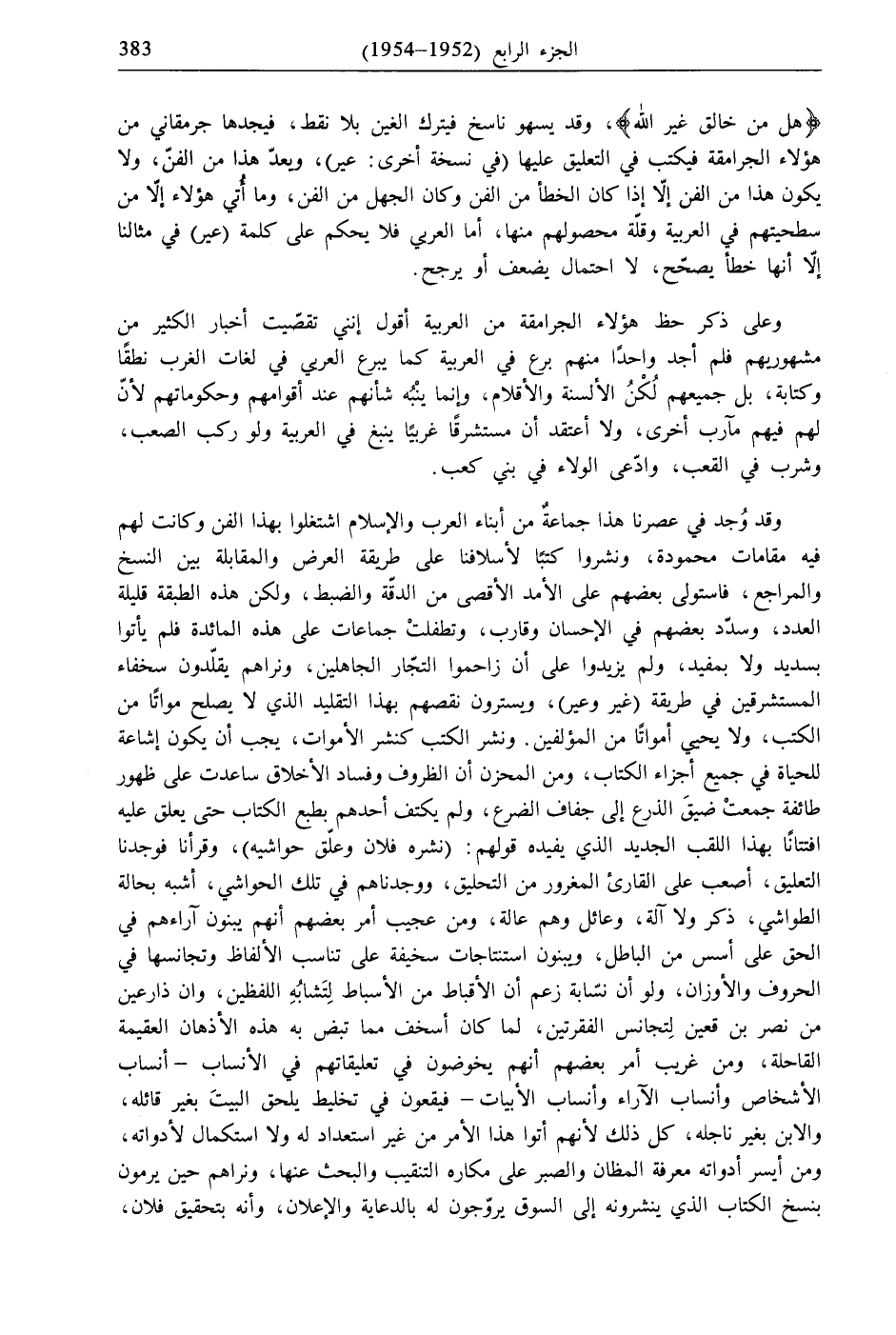 وقد وُجد في عصرنا هذا جماعةٌ من أبناء العرب والإسلام اشتغلوا بهذا الفن وكانت لهم فيه مقامات محمودة، ونشروا كتبًا لأسلافنا على طريقة العرض والمقابلة بين النسخ والمراجع، فاستولى بعضهم على الأمد الأقصى من الدقّة والضبط، ولكن هذه الطبقة قليلة العدد، وسدّد بعضهم في الإحسان وقارب، وتطفلتْ جماعات على هذه المائدة فلم يأتوا بسديد ولا بمفيد، ولم يزيدوا على أن زاحموا التجّار الجاهلين، ونراهم يقلّدون سخفاء المستشرقين في طريقة (غير وعير)، ويسترون نقصهم بهذا التقليد الذي لا يصلح مواتًا من الكتب، ولا يحصي أمواتًا من المؤلفين. ونشر الكتب كنشر الأموات، يجب أن يكون إشاعة للحياة في جميع أجزاء الكتاب، ومن المحزن أن الظروف وفساد الأخلاق ساعدت على ظهور طائفة جمعتْ ضيقَ الذرع إلى جفاف الضرع، ولم يكتف أحدهم بطبع الكتاب حتى يعلق عليه افتتانًا بهذا اللقب الجديد الذي يفيده قولهم: (نشره فلان وعلّق حواشيه)، وقرأنا فوجدنا التعليق، أصعب على القارئ المغرور من التحليق، ووجدناهم في تلك الحواشي، أشبه بحالة الطواشي، ذكر ولا آلة، وعائل وهم عالة، ومن عجيب أمر بعضهم أنهم يبنون آراءهم في الحق على أسس من الباطل، ويبنون استنتاجات سخيفة على تناسب الألفاظ وتجانسها في الحروف والأوزان، ولو أن نسّابة زعم أن الأقباط من الأسباط لِتَشابُهِ اللفظين، وان ذارعين من نصر بن قعين لِتجانس الفقرتين، لما كان أسخف مما تبض به هذه الأذهان العقيمة القاحلة، ومن غريب أمر بعضهم أنهم يخوضون في تعليقاتهم في الأنساب- أنساب الأشخاص وأنساب الآراء وأنساب الأبيات- فيقعون في تخليط يلحق البيتَ بغير قائله، والابن بغير ناجله، كل ذلك لأنهم أتوا هذا الأمر من غير استعداد له ولا استكمال لأدواته، ومن أيسر أدواته معرفة المظان والصبر على مكاره التنقيب والبحث عنها، ونراهم حين يرمون بنسخ الكتاب الذي ينشرونه إلى السوق يروّجون له بالدعاية والإعلان، وأنه بتحقيق فلان،