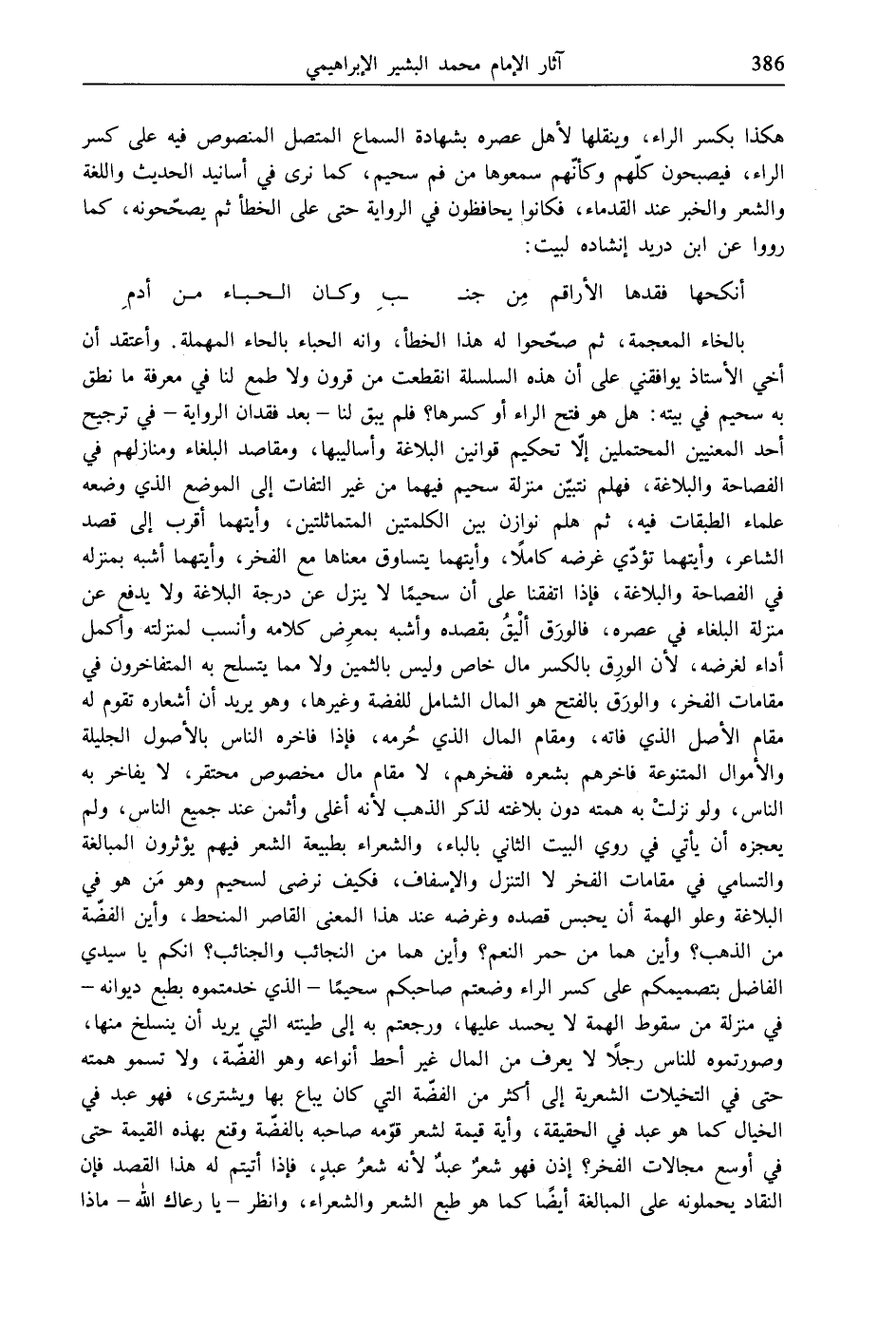 بالخاء المعجمة، ثم صحّحوا له هذا الخطأ، وانه الحباء بالحاء المهملة. وأعتقد أن أخي الأستاذ يوافقني على أن هذه السلسلة انقطعت من قرون ولا طمع لنا في معرفة ما نطق به سحيم في بيته: هل هو فتح الراء أو كسرها؟ فلم يبق لنا- بعد فقدان الرواية- في ترجيح أحد المعنيين المحتملين إلّا تحكيم قوانين البلاغة وأساليبها، ومقاصد البلغاء ومنازلهم في الفصاحة والبلاغة، فهلم نتبيّن منزلة سحيم فيهما من غير التفات إلى الموضع الذي وضعه علماء الطبقات فيه، ثم هلم نوازن بين الكلمتين المتماثلتين، وأيتهما أقرب إلى قصد الشاعر، وأيتهما تؤدّي غرضه كاملًا، وأيتهما يتساوق معناها مع الفخر، وأيتهما أشبه بمنزله في الفصاحة والبلاغة، فإذا اتفقنا على أن سحيمًا لا يزل عن درجة البلاغة ولا يدفع عن منزلة البلغاء في عصره، فالورَق ألْيقُ بقصده وأشبه بمعرِض كلامه وأنسب لمنزلته وأكمل أداء لغرضه، لأن الورِق بالكسر مال خاص وليس بالثمين ولا مما يتسلح به المتفاخرون في مقامات الفخر، والورَق بالفتح هو المال الشامل للفضة وغيرها، وهو يريد أن أشعاره تقوم له مقام الأصل الذي فاته، ومقام المال الذي حُرمه، فإذا فاخره الناس بالأصول الجليلة والأموال المتنوعة فاخرهم بشعره ففخرهم، لا مقام مال مخصوص محتقر، لا يفاخر به الناس، ولو نزلتْ به همته دون بلاغته لذكر الذهب لأنه أغلى وأثمن عند جميع الناس، ولم يعجزه أن يأتي في روي البيت الثاني بالباء، والشعراء بطبيعة الشعر فيهم يؤثرون المبالغة والتسامي في مقامات الفخر لا التنزل والإسفاف، فكيف نرضى لسحيم وهو مَن هو في البلاغة وعلو الهمة أن يحبس قصده وغرضه عند هذا المعنى القاصر المنحط، وأين الفضّة من الذهب؟ وأين هما من حمر النعم؟ وأين هما من النجائب والجنائب؟ إنكم يا سيدي الفاضل بتصميمكم على كسر الراء وضعتم صاحبكم سحيمًا- الذي خدمتموه بطبع ديوانه- في منزلة من سقوط الهمة لا يحسد عليها، ورجعتم به إلى طينته التي يريد أن ينسلخ منها، وصورتموه للناس رجلًا لا يعرف من المال غير أحط أنواعه وهو الفضة، ولا تسمو همته حتى في التخيلات الشعرية إلى أكثر من الفضّة التي كان يباع بها ويشترى، فهو عبد في الخيال كما هو عبد في الحقيقة، وأية قيمة لشعر قوّمه صاحبه بالفضة وقنع بهذه القيمة حتى في أوسع مجالات الفخر؟ إذن فهو شعرٌ عبدٌ لأنه شعرُ عبدٍ، فإذا أتيتم له هذا القصد فإن النقاد يحملونه على المبالغة أيضًا كما هو طبع الشعر والشعراء، وانظر- يا رعاك الله- ماذا