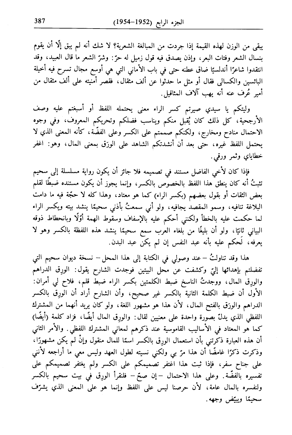 وليتكم يا سيدي صيرتم كسر الراء معنى يحتمله اللفظ أو أسبغتم عليه وصف الأرجحية، كل ذلك كان يُقبل منكم ويناسب فضلكم وتحريكم المعروف، وفي وجوه الاحتمال منادح ومخارج، ولكنكم صممتم على الكسر وعلى الفضّة، كأنه المعنى الذي لا يحتمل اللفظ غيره، حتى بعد أن أنشدتكم الشاهد على الورَق بمعنى المال، وهو: اغفر خطاياي وثمر ورقي.