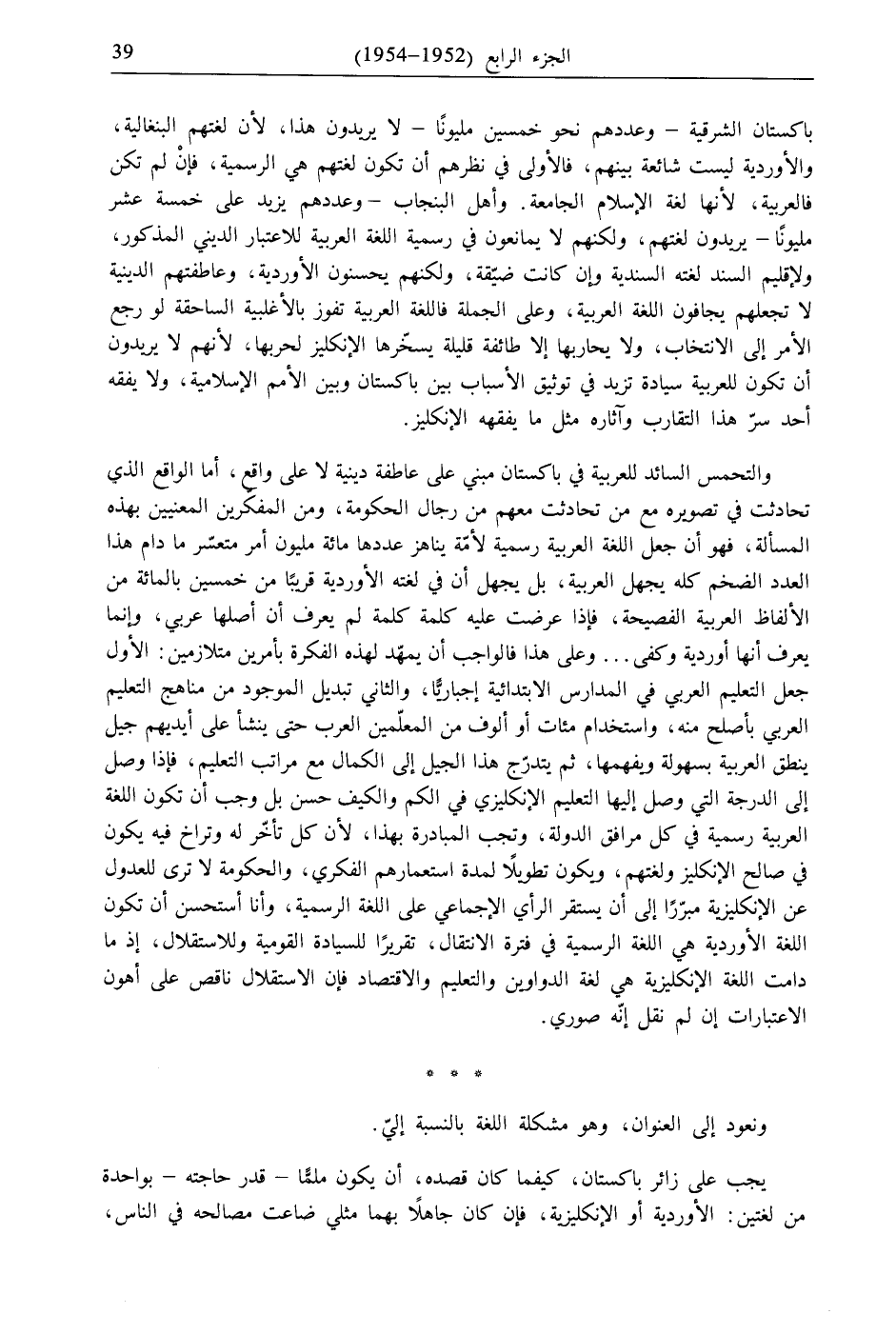 والتحمس السائد للعربية في باكستان مبني على عاطفة دينية لا على واقع، أما الواقع الذي تحادثت في تصويره مع من تحادثت معهم من رجال الحكومة، ومن المفكرين المعنيين بهذه المسألة، فهو أن جعل اللغة العربية رسمية لأمّة يناهز عددها مائة مليون أمر متعسّر ما دام هذا العدد الضخم كله يجهل العربية، بل يجهل أن في لغته الأوردية قريبًا من خمسين بالمائة من الألفاظ العربية الفصيحة، فإذا عرضت عليه كلمة كلمة لم يعرف أن أصلها عربي، وإنما يعرف أنها أوردية وكفى ... وعلى هذا فالواجب أن يمهّد لهذه الفكرة بأمرين متلازمين: الأول جعل التعليم العربي في المدارس الابتدائية إجبارًّيا، والثاني تبديل الموجود من مناهج التعليم العربي بأصلح منه، واستخدام مئات أو ألوف من المعلّمين العرب حتى ينشأ على أيديهم جيل ينطق العربية بسهولة ويفهمها، ثم يتدرّج هذا الجيل إلى الكمال مع مراتب التعليم، فإذا وصل إلى الدرجة التي وصل إليها التعليم الإنكليزي في الكم والكيف حسن بل وجب أن تكون اللغة العربية رسمية في كل مرافق الدولة، وتجب المبادرة بهذا، لأن كل تأخّر له وتراخ فيه يكون في صالح الإنكليز ولغتهم، ويكون تطويلًا لمدة استعمارهم الفكري، والحكومة لا ترى للعدول عن الإنكليزية مبرّرًا إلى أن يستقر الرأي الإجماعي على اللغة الرسمية، وأنا أستحسن أن تكون اللغة الأوردية هي اللغة الرسمية في فترة الانتقال، تقريرًا للسيادة القومية وللاستقلال، إذ ما دامت اللغة الإنكليزية هي لغة الدواوين والتعليم والاقتصاد فإن الاستقلال ناقص على أهون الاعتبارات إن لم نقل إنّه صوري.