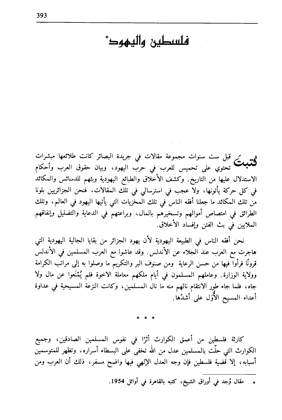 كتبتُ قبل ست سنوات مجموعة مقالات في جريدة البصائر كانت طلائعها مبشرات تحتوي على تحميس للعرب في حرب اليهود، وبيان حقوق العرب وأحكام الاستدلال عليها من التاريخ. وكشف الأخلاق والطبائع اليهودية وبثهم للدسائس والمكائد في كل حركة يأتونها، ولا عجب في استرسالي في تلك المقالات، فنحن الجزائريين بلونا من تلك المكائد ما جعلنا أفقه الناس في تلك المخزيات التي يأتيها اليهود في العالم، وتلك الطرائق في امتصاص أموالهم وتسخيرهم بالمال، وبراعتهم في الدعاية والتضليل وإنفاقهم الملايين في بث الفتن وإفساد الأخلاق.