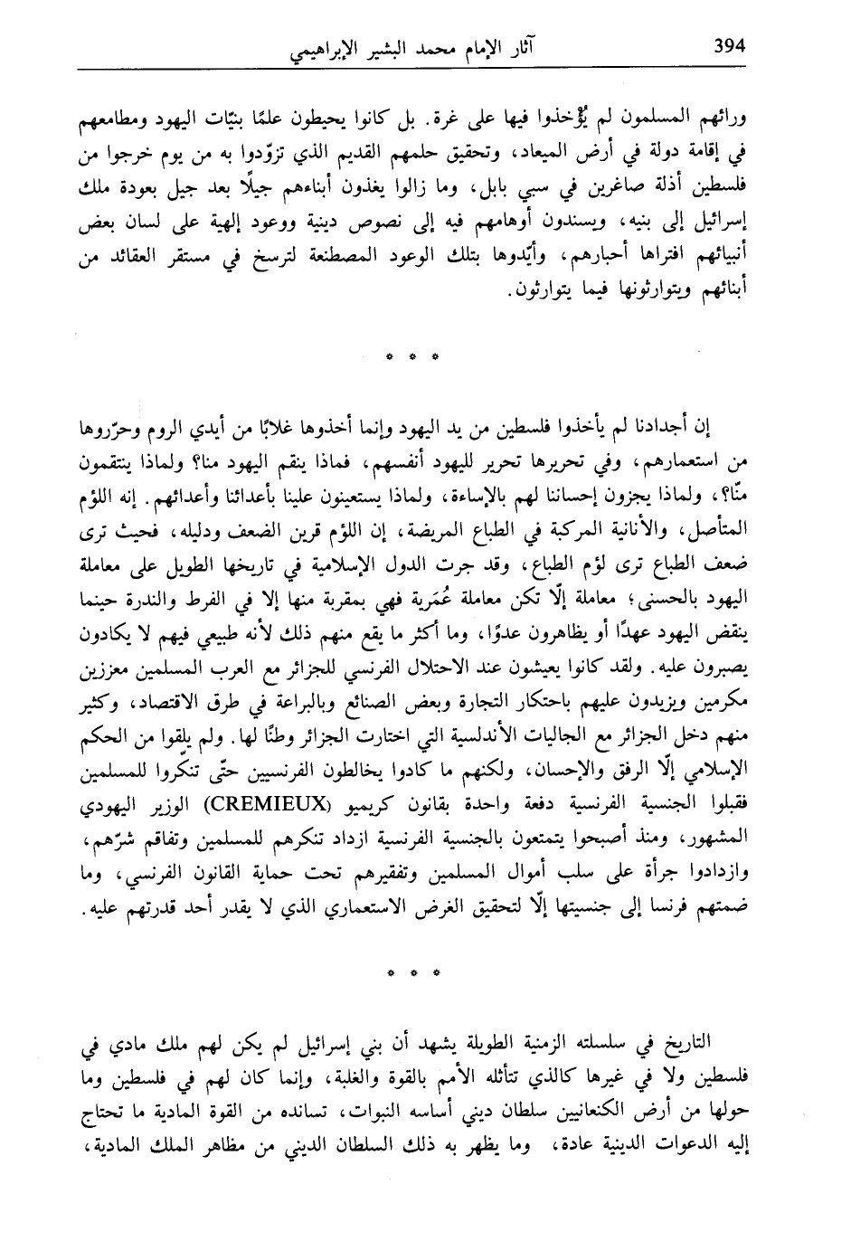 إن أجدادنا لم يأخذوا فلسطين من يد اليهود وإنما أخذوها غلابًا من أيدي الروم وحرّروها من استعمارهم، وفي تحريرها تحرير لليهود أنفسهم، فماذا ينقم اليهود منا؟ ولماذا ينتقمون منا؟، ولماذا يجزون إحساننا لهم بالإساءة، ولماذا يستعينون علينا بأعدائنا وأعدائهم. إنه اللؤم المتأصل، والأنانية المركبة في الطباع المريضة، إن اللؤم قرين الضعف ودليله، فحيث ترى ضعف الطباع ترى لؤم الطباع، وقد جرت الدول الإسلامية في تاريخها الطويل على معاملة اليهود بالحسنى، معاملة إلّا تكن معاملة عُمَرية فهي بمقربة منها إلا في الفرط والندرة حينما ينقض اليهود عهدًا أو يظاهرون عدوًا، وما أكثر ما يقع منهم ذلك لأنه طبيعي فيهم لا يكادون يصبرون عليه. ولقد كانوا يعيشون عند الاحتلال الفرنسي للجزائر مع العرب المسلمين معززين مكرمين ويزيدون عليهم باحتكار التجارة وبعض الصنائع وبالبراعة في طرق الاقتصاد، وكثير منهم دخل الجزائر مع الجاليات الأندلسية التي اختارت الجزائر وطنًا لها. ولم يلقوا من الحكم الإسلامي إلّا الرفق والإحسان، ولكنهم ما كادوا يخالطون الفرنسيين حتّى تنكّروا للمسلمين فقبلوا الجنسية الفرنسية دفعة واحدة بقانون كريميو ( CREMIEUX) الوزير اليهودي المشهور، ومنذ أصبحوا يتمتعون بالجنسية الفرنسية ازداد تنكرهم للمسلمين وتفاقم شرّهم، وازدادوا جرأة على سلب أموال المسلمين وتفقيرهم تحت حماية القانون الفرنسي، وما ضمتهم فرنسا إلى جنسيتها إلّا لتحقيق الغرض الاستعماري الذي لا يقدر أحد قدرتهم عليه.