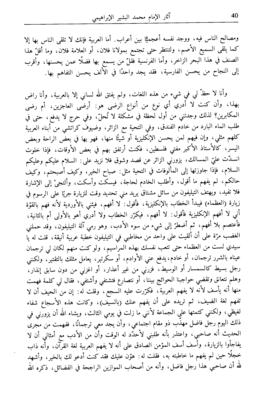 ومصالح الناس فيه، ووجد نفسه أعجميًّا بين أعراب. أما العربية فإنك لا تلقى الناس بها إلا كما يلقى السميع الأصم، ولتنتظر حتى تجتمع بمولانا فلان، أو العلامة فلان، وما أقلّ هذا الصنف في هذا البحر الزاخر، وأما الفرنسية فقل من يسمع بها فضلًا عمن يحسنها، وأقرب إلى النجاح من يحسن الفارسية، فقد يجد واحدًا في الألف يحسن التفاهم بها.