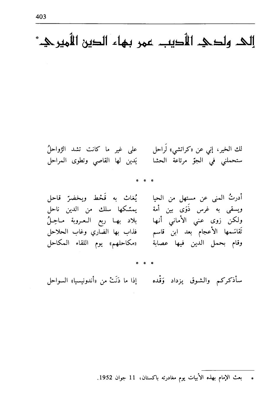* بعث الإمام بهذه الأبيات يوم مغادرته باكستان، 11 جوان 1952.