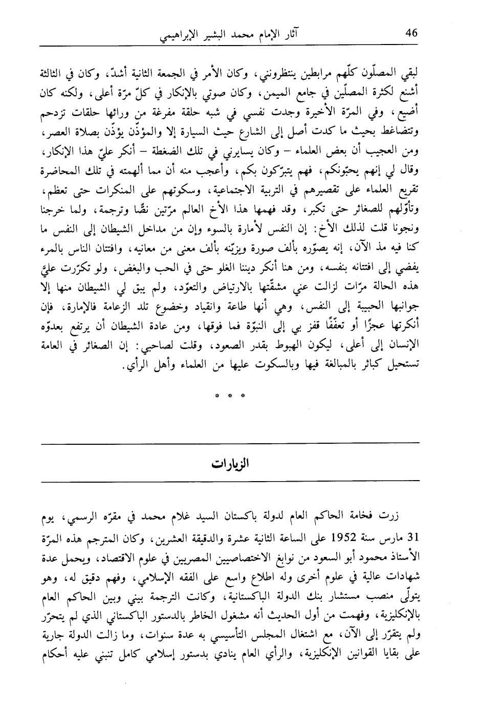 زرت فخامة الحاكم العام لدولة باكستان السيد غلام محمد في مقرّه الرسمي، يوم 31 مارس سنة 1952 على الساعة الثانية عشرة والدقيقة العشرين، وكان المترجم هذه المرّة الأستاذ محمود أبو السعود من نوابغ الاختصاصيين المصريين في علوم الاقتصاد، ويحمل عدة شهادات عالية في علوم أخرى وله اطلاع واسع على الفقه الإسلامي، وفهم دقيق له، وهو يتولّى منصب مستشار بنك الدولة الباكستانية، وكانت الترجمة بيني وبين الحاكم العام بالإنكليزية، وفهمت من أول الحديث أنه مشغول الخاطر بالدستور الباكستاني الذي لم يتحرّر ولم يتقرّر إلى الآن، مع اشتغال المجلس التأسيسي به عدة سنوات، وما زالت الدولة جارية على بقايا القوانين الإنكليزية، والرأي العام ينادي بدستور إسلامي كامل تنبني عليه أحكام