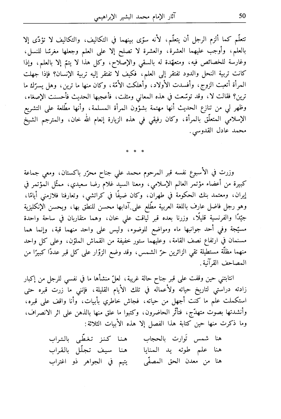 تتعلّم كما ألزم الرجل أن يتعلّم، لأنه سوّى بينهما في التكاليف، والتكاليف لا تؤدّى إلا بالعلم، وأوجب عليهما العشرة، والعشرة لا تصلح إلا على العلم وجعلها مغرسًا للنسل، وغارسة للخصائص فيه، ومتعهّدة له بالسقي والإصلاح، وكل هذا لا يتمّ إلا بالعلم، وإذا كانت تربية النحل والدود تفتقر إلى العلم، فكيف لا تفتقر إليه تربية الإنسان؟ فإذا جهلت المرأة أتعبت الزوج، وأفسدت الأولاد، وأهلكت الأمّة، وكان منها ما ترين، وهل يسرّك ما ترين؟ فقالت لا، وقد توسّعت في هذه المعاني ومثلت، فأعجبها الحديث فأحسنت الإصغاء، وظهر لي من تنازع الحديث أنها مهتمة بشؤون المرأة المسلمة، وأنها مطّلعة على التشريع الإسلامي المتعلّق بالمرأة، وكان رفيقي في هذه الزيارة إنعام الله خان، والمترجم الشيخ محمد عادل القدوسي.