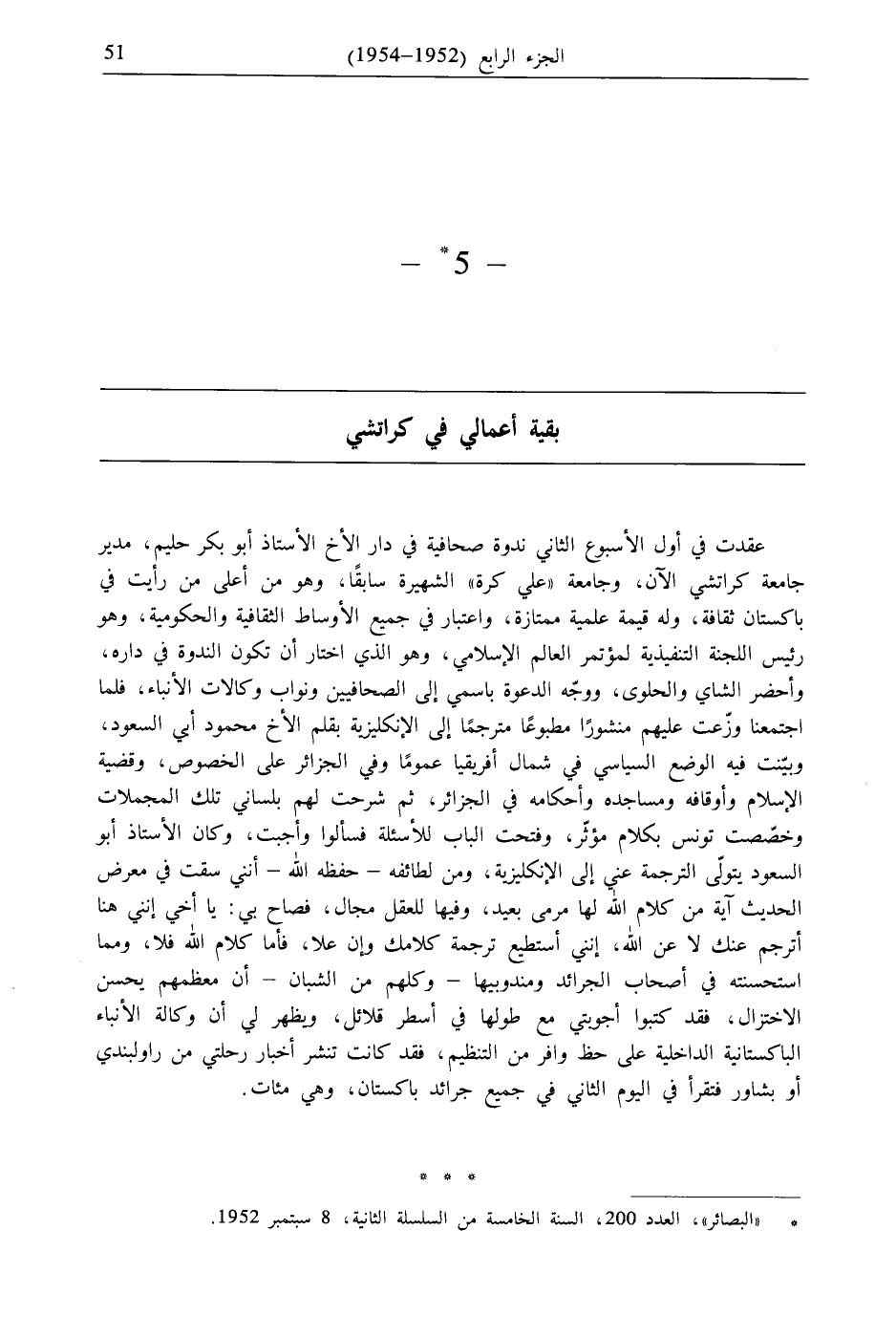 عقدت في أول الأسبوع الثاني ندوة صحافية في دار الأخ الأستاذ أبو بكر حليم، مدير جامعة كراتشي الآن، وجامعة "علي كرة" الشهيرة سابقًا، وهو من أعلى من رأيت في باكستان ثقافة، وله قيمة علمية ممتازة، واعتبار في جميع الأوساط الثقافية والحكومية، وهو رئيس اللجنة التنفيذية لمؤتمر العالم الإسلامي، وهو الذي اختار أن تكون الندوة في داره، وأحضر الشاي والحلوى، ووجّه الدعوة باسمي إلى الصحافيين ونواب وكالات الأنباء، فلما اجتمعنا وزّعت عليهم منشورًا مطبوعًا مترجمًا إلى الإنكليزية بقلم الأخ محمود أبي السعود، وبيّنت فيه الوضع السياسي في شمال أفريقيا عمومًا وفي الجزائر على الخصوص، وقضية الإسلام وأوقافه ومساجده وأحكامه في الجزائر، ثم شرحت لهم بلساني تلك المجملات وخصّصت تونس بكلام مؤثّر، وفتحت الباب للأسئلة فسألوا وأجبت، وكان الأستاذ أبو السعود يتولّى الترجمة عني إلى الإنكليزية، ومن لطائفه- حفظه الله- أنني سقت في معرض الحديث آية من كلام الله لها مرمى بعيد، وفيها للعقل مجال، فصاح بي: يا أخي إنني هنا أترجم عنك لا عن الله، إنني أستطيع ترجمة كلامك وإن علا، فأما كلام الله فلا، ومما استحسنته في أصحاب الجرائد ومندوبيها- وكلهم من الشبان- أن معظمهم يحسن الاختزال، فقد كتبوا أجويتي مع طولها في أسطر قلائل، ويظهر لي أن وكالة الأنباء الباكستانية الداخلية على حظ وافر من التنظيم، فقد كانت تنشر أخبار رحلتي من راولبندي أو بشاور فتقرأ في اليوم الثاني في جميع جرائد باكستان، وهي مئات.