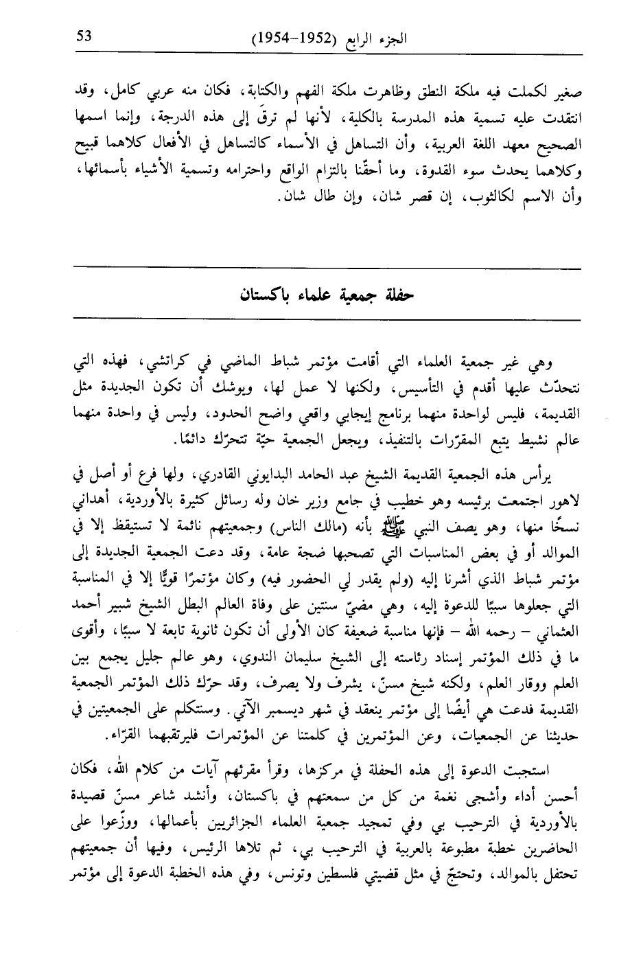 وهي غير جمعية العلماء التي أقامت مؤتمر شباط الماضي في كراتشي، فهذه التي نتحدّث عليها أقدم في التأسيس، ولكنها لا عمل لها، ويوشك أن تكون الجديدة مثل القديمة، فليس لواحدة منهما برنامج إيجابي واقعي واضح الحدود، وليس في واحدة منهما عالم نشيط يتبع المقرّرات بالتنفيذ، ويجعل الجمعية حيّة تتحرّك دائمًا.