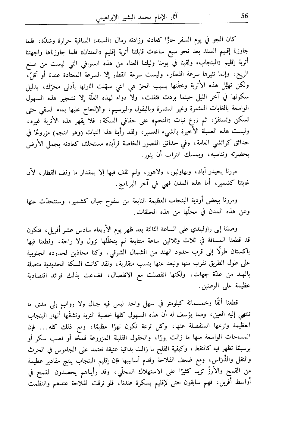 قطعنا ألفًا وخمسمائة كيلومتر في سهل واحد ليس فيه جبال ولا روابٍ إلى مدى ما تنتهي إليه العين، ومما يؤسف له أن هذه السهول كلها خصبة التربة وتشقّها أنهار البنجاب العظيمة وترعها المنفصلة عنها، وكل ترعة تكون نهرًا عظيمًا، ومع ذلك كله ... فإن المساحات الواسعة منها ما زالت بورًا، والحقول القليلة المزروعة قمحًا أو قصب سكر أو برسيمًا تظهر فيه كالنقط، وكيفية الفلح ما زالت بدائية عتيقة تعتمد على الجاموس في الحرث والنقل والدِّرَاس، ومع ضعف الفلاحة وقدم أساليبها فإن إقليم البنجاب ينتج مقادير عظيمة من القمح والأرزّ تزيد كثيرًا على الاستهلاك المحلّي، وقد رأيناهم يحصدون القمح في أواسط أفريل، فهم سابقون حتى لإقليم بسكرة عندنا، فلو ترقت الفلاحة عندهم وانتظمت