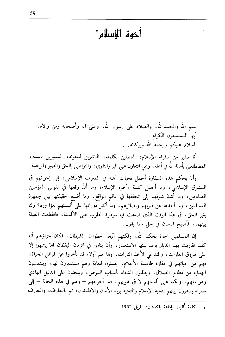 * كلمة أُلقيت بإذاعة باكستان، أفريل 1952.