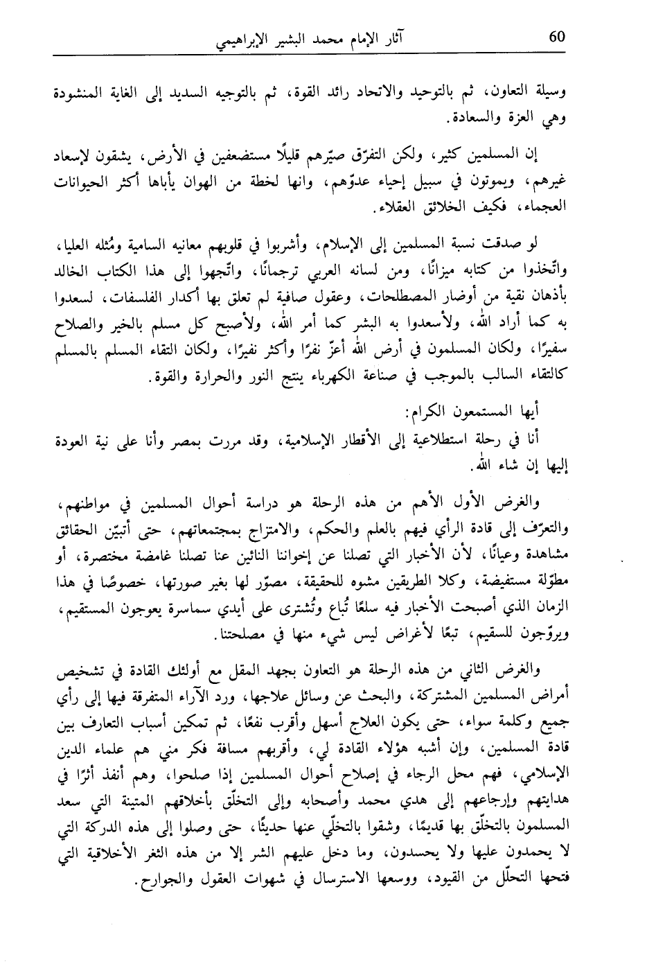 والغرض الثاني من هذه الرحلة هو التعاون بجهد المقل مع أولئك القادة في شخيص أمراض المسلمين المشتركة، والبحث عن وسائل علاجها، ورد الآراء المتفرقة فيها إلى رأي جميع وكلمة سواء، حتى يكون العلاج أسهل وأقرب نفعًا، ثم تمكين أسباب التعارف بين قادة المسلمين، وإن أشبه هؤلاء القادة لي، وأقربهم مسافة فكر مني هم علماء الدين الإسلامي، فهم محل الرجاء في إصلاح أحوال المسلمين إذا صلحوا، وهم أنفذ أثرًا في هدايتهم وإرجاعهم إلى هدي محمد وأصحابه وإلى التخلّق بأخلاقهم المتينة التي سعد المسلمون بالتخلّق بها قديمًا، وشقوا بالتخلّي عنها حديثًا، حتى وصلوا إلى هذه الدركة التي لا يحمدون عليها ولا يحسدون، وما دخل عليهم الشر إلا من هذه الثغر الأخلاقية التي فتحها التحلّل من القيود، ووسعها الاسترسال في شهوات العقول والجوارح.