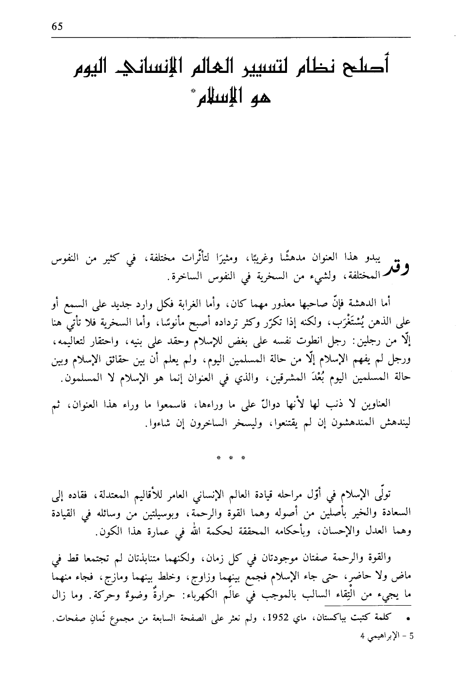 * كلمة كتبت بباكستان، ماي 1952، ولم نعثر على الصفحة السابعة من مجموع ثَمانِ صفحات.