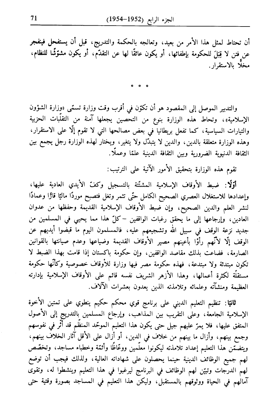 والتدبير الموصل إلى المقصود هو أن تكوّن في أقرب وقت وزارة تسمّى "وزارة الشؤون الإسلامية"، وتحاط هذه الوزارة بنوع من التحصين يجعلها آمنة من التقلّبات الحزبية والتيارات السياسية، كما تفعل بريطانيا في بعض مصالحها التي لا تقوم إلا على الاستقرار، وهذه الوزارة متعلقة بالدين، والدين لا يتبذل ولا يتغير، ويختار لهذه الوزارة رجل يجمع بين الثقافة الدنيوية الضرورية وبين الثقافة الدينية علمًا وعملًا.