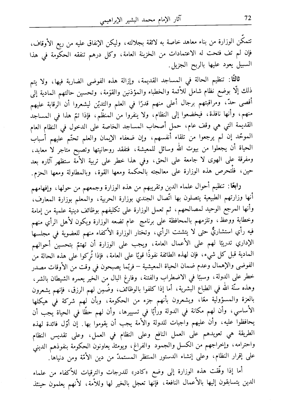 رابعًا: تنظيم أحوال علماء الدين وتقريبهم من هذه الوزارة وجمعهم من حولها، وإفهامهم أنها وزارتهم الطبيعية يتصلون بها اتّصال الجندي بوزارة الحربية، والمعلم بوزارة المعارف، وأنها المرجع الوحيد لمصالحهم، ثم تعمل الوزارة على تكليفهم بوظائف دينية علمية من إمامة وخطابة ووعظ، وتلزمهم بالمحافظة على برنامج عام تضعه الوزارة ويكون لأهل الرأي منهم فيه رأي استشاريّ حتى لا يتشتت الرأي، وتختار الوزارة الأكفاء منهم للعضوية في مجلسها الإداري تدريبًا لهم على الأعمال العامة، ويجب على الوزارة أن تهتمّ بتحسين أحوالهم المادية قبل كل شيء، فإن لهذه الطائفة نفوذًا قويًا على العامة، فإذا تُرِكوا على هذه الحالة من الفوضى والإهمال وعدم ضمان الحياة المعيشية- فربّما يصبحون في وقت من الأوقات مصدر خطر على الدولة، وسببًا في الاضطراب والفتنة، وفارغ البال من الخير يعمره الشيطان بالشر، وهذه سنّة الله في الطباع البشرية، أما إذا كلفوا بالوظائف، وضمِن لهم الرزق، فإنهم يشعرون بالعزة والمسؤولية معًا، ويشعرون بأنهم جزء من الحكومة، وبأن لهم شركة في هيكلها الأساسي، وأن لهم مكانة في الدولة ورأيًا في تسييرها، وأن لهم حظًا في الحياة يجب أن يحافظوا عليه، وأن عليهم واجبات للدولة والأمة يجب أن يقوموا بها. إن أوّل فائدة لهذه الطريقة هي تعويدهم على العمل النافع وعلى النظام في العمل، وعلى تقديس النظام واحترامه، وإخراجهم من الكسل والجمود والفراغ، ويومئذ يعاونون الحكومة بنفوذهم الديني على إقرار النظام، وعلى إنشاء الدستور المنتظر المستمدّ من دين الأمّة ومن دنياها.
