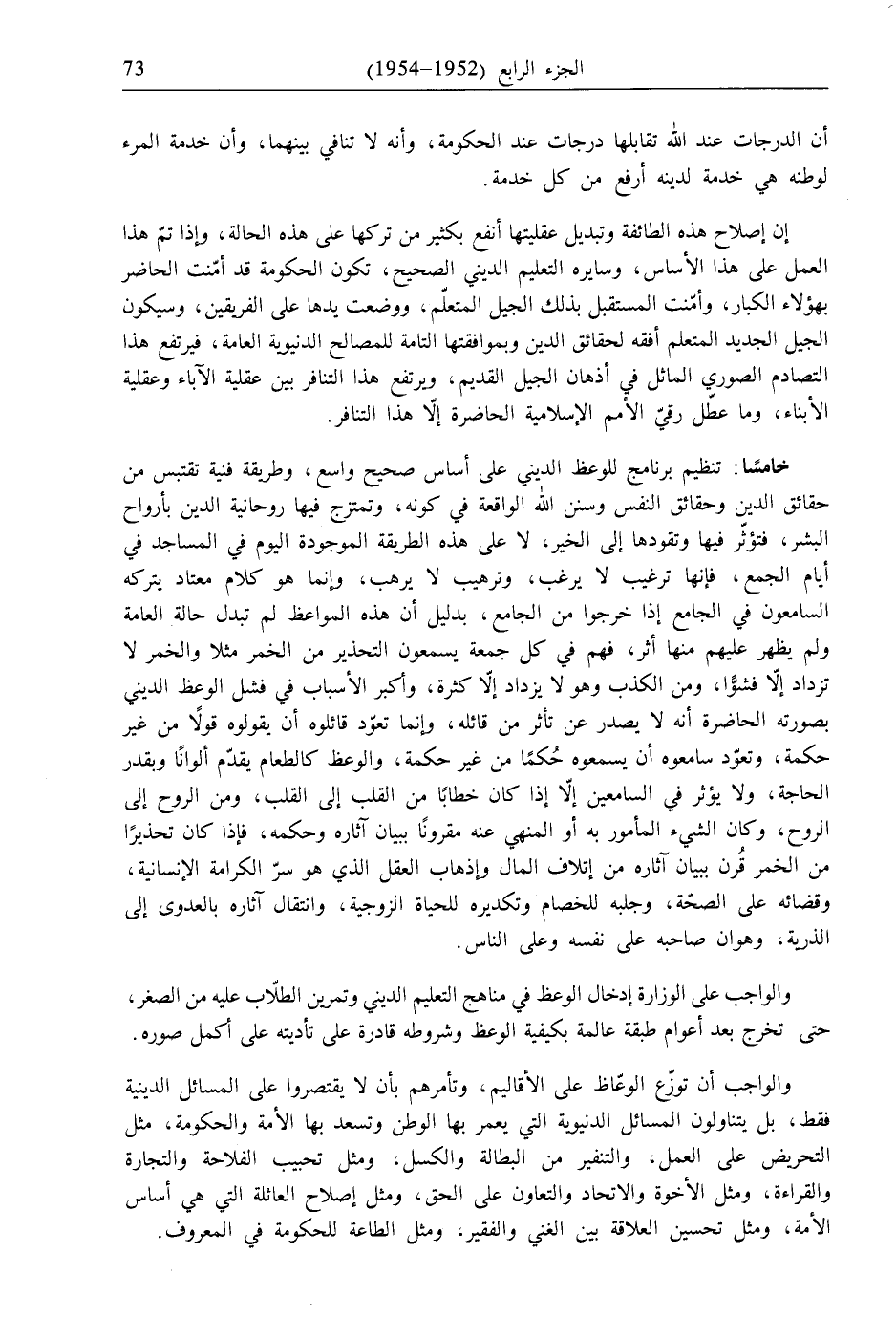 خامسًا: تنظيم برنامج للوعظ الديني على أساس صحيح واسع، وطريقة فنية تقتبس من حقائق الدين وحقائق النفس وسنن الله الواقعة في كونه، وتمتزج فيها روحانية الدين بأرواح البشر، فتؤثّر فيها وتقودها إلى الخير، لا على هذه الطريقة الموجودة اليوم في المساجد في أيام الجمع، فإنها ترغيب لا يرغب، وترهيب لا يرهب، وإنما هو كلام معتاد يتركه السامعون في الجامع إذا خرجوا من الجامع، بدليل أن هذه المواعظ لم تبدل حالة العامة ولم يظهر عليهم منها أثر، فهم في كل جمعة يسمعون التحذير من الخمر مثلا والخمر لا تزداد إلّا فشوًّا، ومن الكذب وهو لا يزداد إلّا كثرة، وأكبر الأسباب في فشل الوعظ الديني بصورته الحاضرة أنه لا يصدر عن تأثر من قائله، وإنما تعوّد قائلوه أن يقولوه قولًا من غير حكمة، وتعوّد سامعوه أن يسمعوه حُكمًا من غير حكمة، والوعظ كالطعام يقدّم ألوانًا وبقدر الحاجة، ولا يؤثر في السامعين إلّا إذا كان خطابًا من القلب إلى القلب، ومن الروح إلى الروح، وكان الشيء المأمور به أو المنهي عنه مقرونًا ببيان آثاره وحكمه، فإذا كان تحذيرًا من الخمر قُرن ببيان آثاره من إتلاف المال وإذهاب العقل الذي هو سرّ الكرامة الإنسانية، وقضائه على الصحّة، وجلبه للخصام وتكديره للحياة الزوجية، وانتقال آثاره بالعدوى إلى الذرية، وهوان صاحبه على نفسه وعلى الناس.