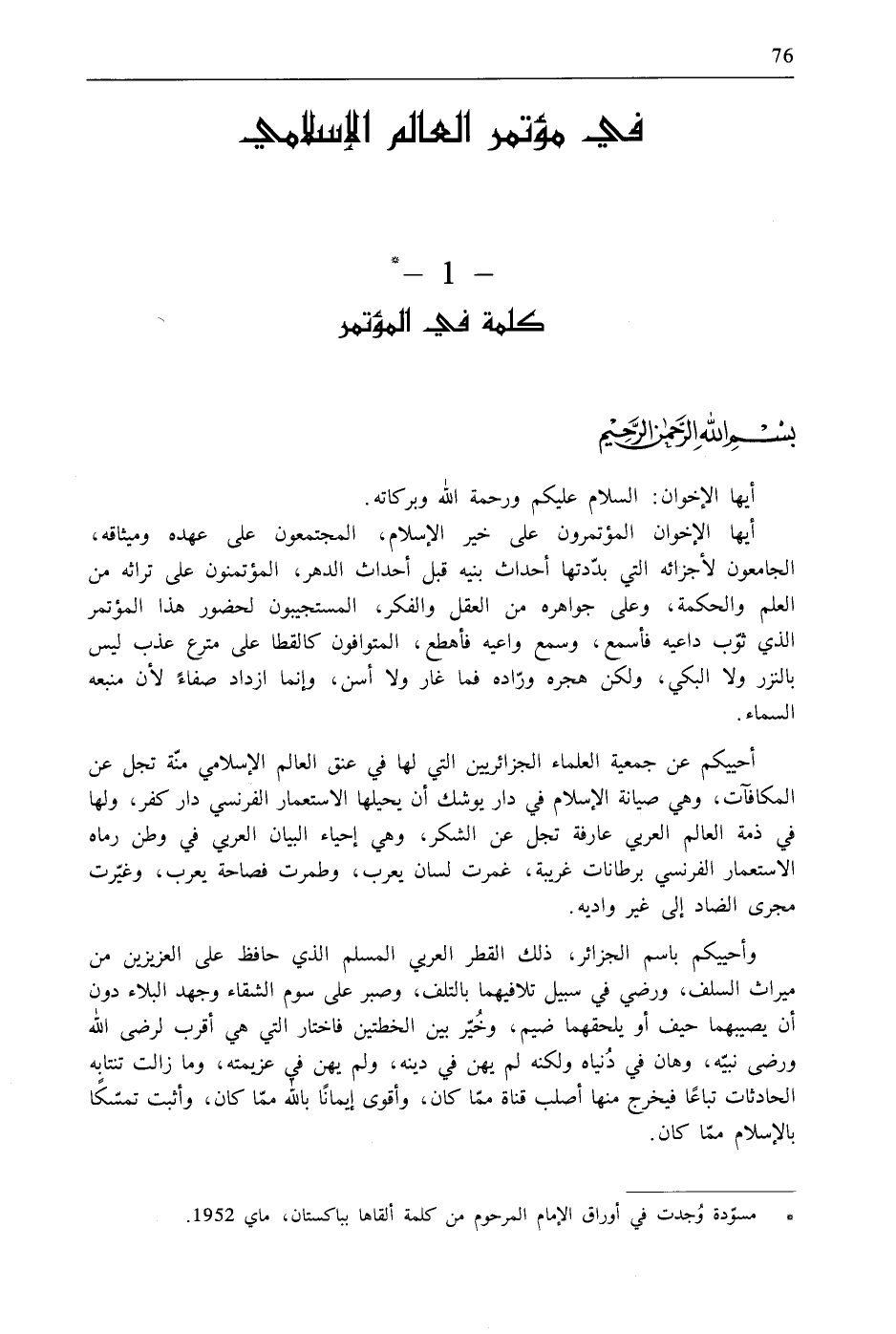 * مسوّدة وُجدت في أوراق الإمام المرحوم من كلمة ألقاها بباكستان، ماي 1952.
