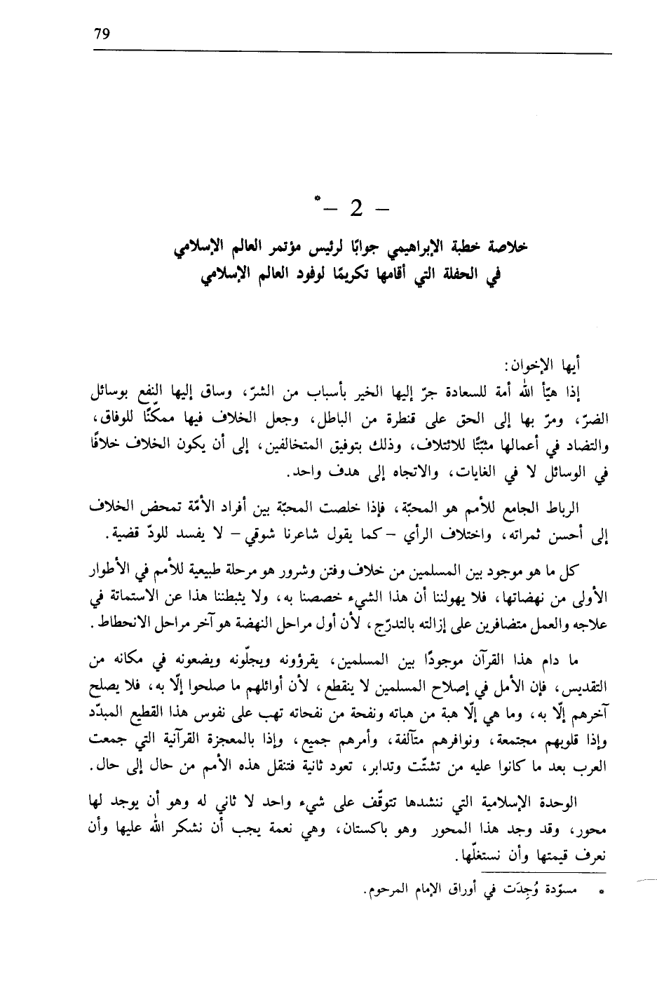 خلاصة خطبة الإبراهيمي جوابًا لرئيس مؤتمر العالم الإسلامي