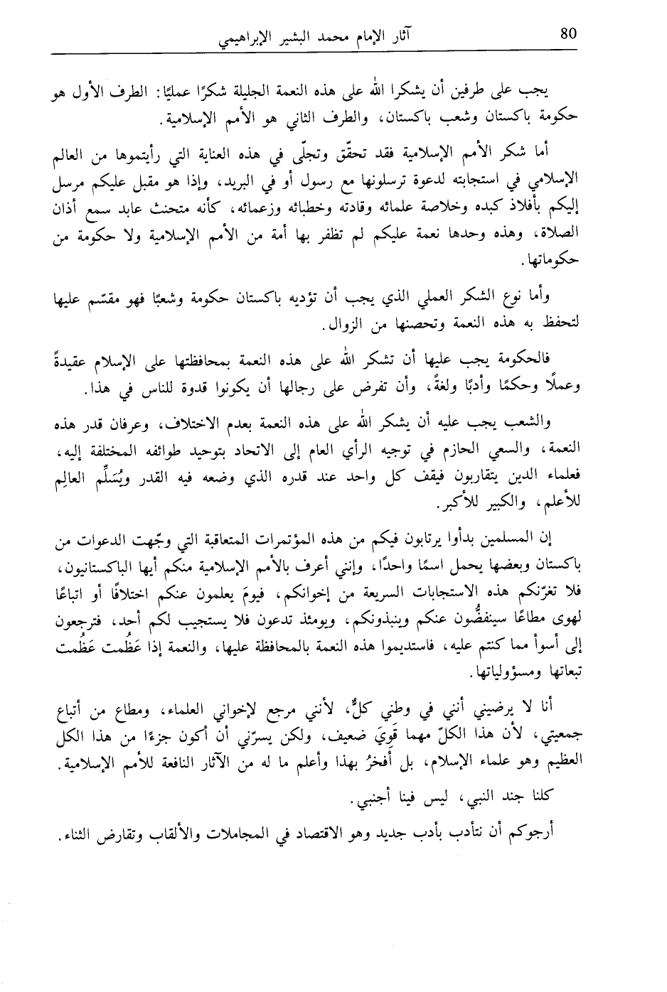 إن المسلمين بدأوا يرتابون فيكم من هذه المؤتمرات المتعاقبة التي وجّهت الدعوات من باكستان وبعضها يحمل اسمًا واحدًا، وإنني أعرف بالأمم الإسلامية منكم أيها الباكستانيون، فلا تغرّنكم هذه الاستجابات السريعة من إخوانكم، فيومَ يعلمون عنكم اختلافًا أو اتباعًا لهوى مطاعًا سينفضّون عنكم وينبذونكم، ويومئذ تدعون فلا يستجيب لكم أحد، فترجعون إلى أسوأ مما كنتم عليه، فاستديموا هذه النعمة بالمحافظة عليها، والنعمة إذا عَظُمت عَظُمت تبعاتها ومسؤولياتها.