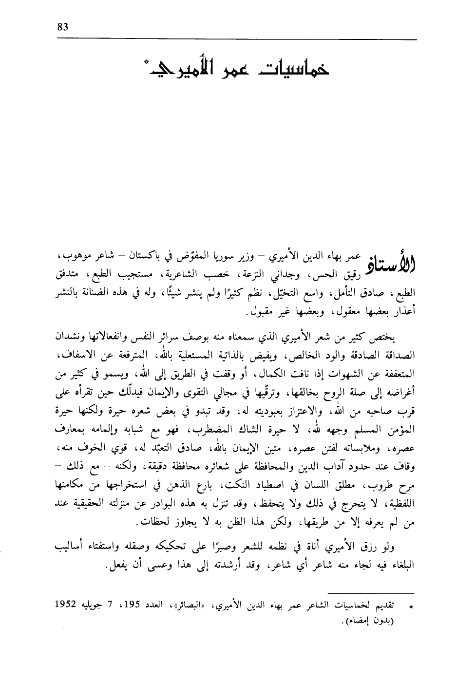 * تقديم لخماسيات الشاعر عمر بهاء الدين الأميري، «البصائر»، العدد 195، 7 جويليه 1952 (بدون إمضاء).