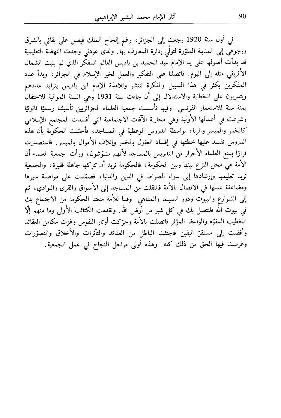 في أول سنة 1920 رجعت إلى الجزائر، رغم إلحاح الملك فيصل على بقائي بالشرق ورجوعي إلى المدينة المنوّرة لتولّي إدارة المعارف بها. ولدى عودتي وجدت النهضة التعليمية قد بدأت أصولها على يد الإمام عبد الحميد بن باديس العالم المفكر الذي لم ينبت الشمال الأفريقي مثله إلى اليوم. فاتصلنا على التفكير والعمل لخير الإسلام في الجزائر، وبدأ عدد المفكرين يكثر في هذا السبيل والفكرة تنتشر وتلامذة الإمام ابن باديس يتزايد عددهم ويتدربون على الخطابة والاستدلال إلى أن جاءت سنة 1931 وهي السنة الموالية للاحتفال بمئة سنة للاستعمار الفرنسي. وفيها تأسست جمعية العلماء الجزائريين تأسيسًا رسميًا قانونيًا وشرعت في أعمالها الأولية وهي محاربة الآفات الاجتماعية التي أفسدت المجتمع الإسلامي كالخمر والميسر والزنا، بواسطة الدروس الوعظية في المساجد، فأحسّت الحكومة بأن هذه الدروس تفسد عليها خطتها في إفساد العقول بالخمر وإتلاف الأموال بالميسر. فاستصدرت قرارًا بمنع العلماء الأحرار من التدريس بالمساجد لأنهم مشوّشون، ورأت جمعية العلماء أن الأمة هي محل النزاع بينها وبين الحكومة، فالحكومة تريد أن تتركها جاهلة فقيرة، والجمعية تريد تعليمها وإرشادها إلى سواء الصراط في الدين والدنيا، فصمّمت على مواصلة سيرها ومضاعفة عملها في الاتصال بالأمة فانتقلت من المساجد إلى الأسواق والقرى والبوادي، ثم إلى الشوارع والبيوت ودور السينما والمقاهي. وقلنا للأمة منعتنا الحكومة من الاجتماع بك في بيوت الله فلنتصل بك في كل شبر من أرض الله. وتقدمت الكتائب الأولى وما منهم إلا الخطيب المفوّه والواعظ المؤثر فاتصلت بالأمة وحرّكت أوتار النفوس وغزت مكامن العقائد وأفضت إلى مستقرّ اليقين فاجتثت الباطل من العقائد والتأثرات والأخلاق والتصوّرات وغرست فيها الحق من ذلك كله. وهذه أولى مراحل النجاح في عمل الجمعية.