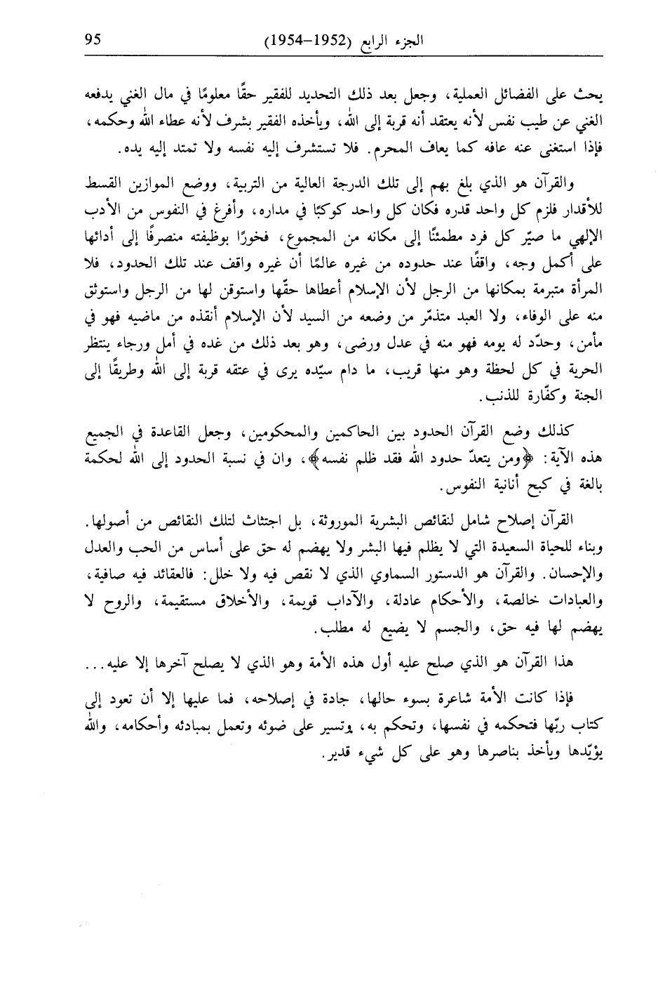القرآن إصلاح شامل لنقائص البشرية الموروثة، بل اجتثاث لتلك النقائص من أصولها. وبناء للحياة السعيدة التي لا يظلم فيها البشر ولا يهضم له حق على أساس من الحب والعدل والإحسان. والقرآن هو الدستور السماوي الذي لا نقص فيه ولا خلل: فالعقائد فيه صافية، والعبادات خالصة، والأحكام عادلة، والآداب قويمة، والأخلاق مستقيمة، والروح لا يهضم لها فيه حق، والجسم لا يضيع له مطلب.