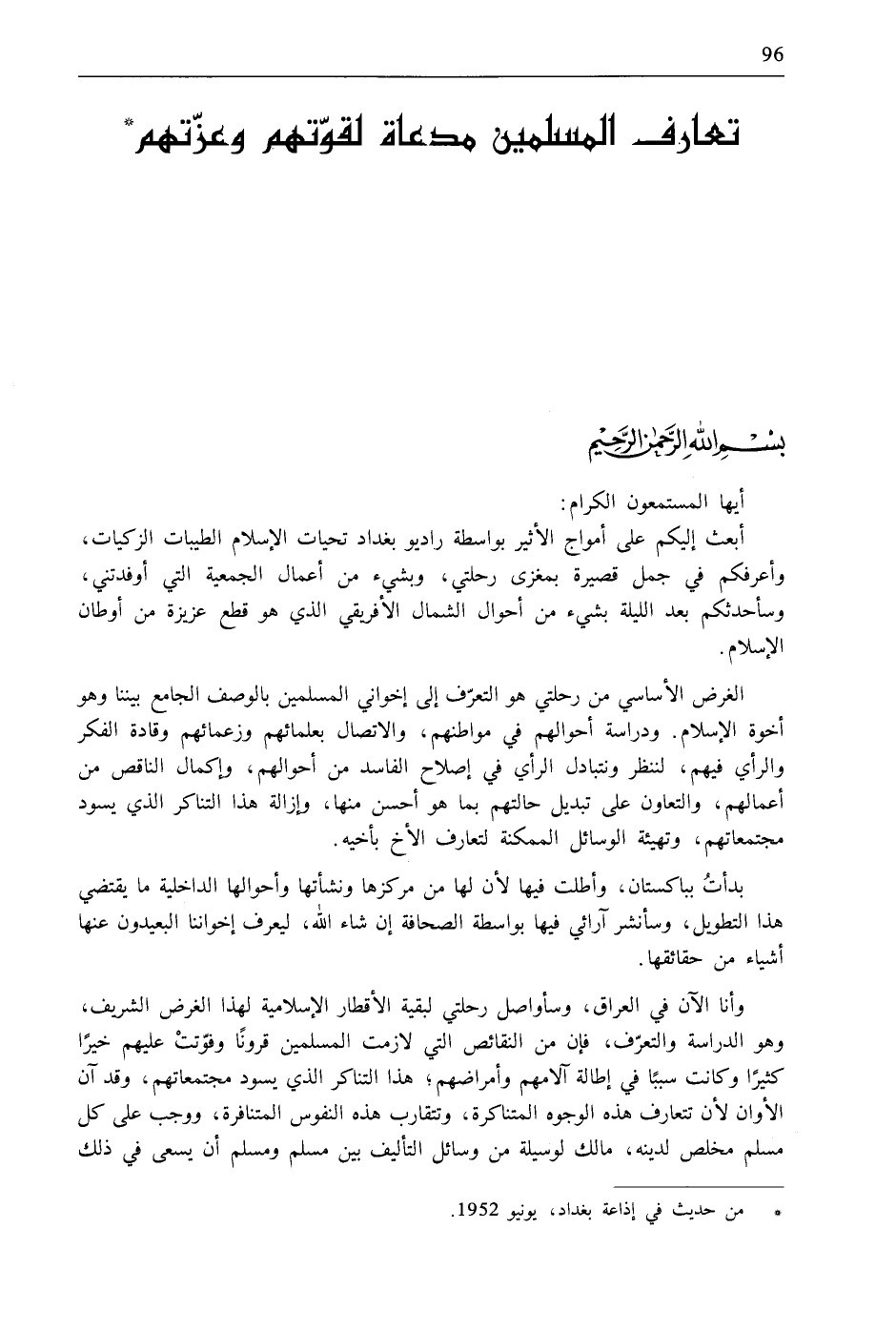 أبعث إليكم على أمواج الأثير بواسطة راديو بغداد تحيات الإسلام الطيبات الزكيات، وأعرفكم في جمل قصيرة بمغزى رحلتي، وبشيء من أعمال الجمعية التي أوفدتني، وسأحدثكم بعد الليلة بشيء من أحوال الشمال الأفريقي الذي هو قطع عزيزة من أوطان الإسلام.