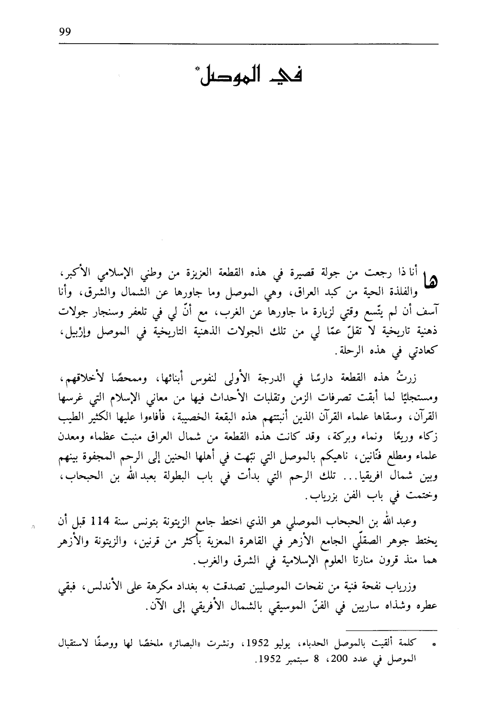 زرتُ هذه القطعة دارسًا في الدرجة الأولى لنفوس أبنائها، وممحصًا لأخلاقهم، ومستجليًا لما أبقت تصرفات الزمن وتقلبات الأحداث فيها من معاني الإسلام التي غرسها القرآن، وسقاها علماء القرآن الذين أنبتتهم هذه البقعة الخصيبة، فأفاءوا عليها الكثير الطيب زكاء وريعًا ونماء وبركة، وقد كانت هذه القطعة من شمال العراق منبت عظماء ومعدن علماء ومطلع فنّانين، ناهيكم بالموصل التي نبّهت في أهلها الحنين إلى الرحم المجفوة بينهم وبين شمال افريقيا ... تلك الرحم التي بدأت في باب البطولة بعبد الله بن الحبحاب، وختمت في باب الفن بزرياب.