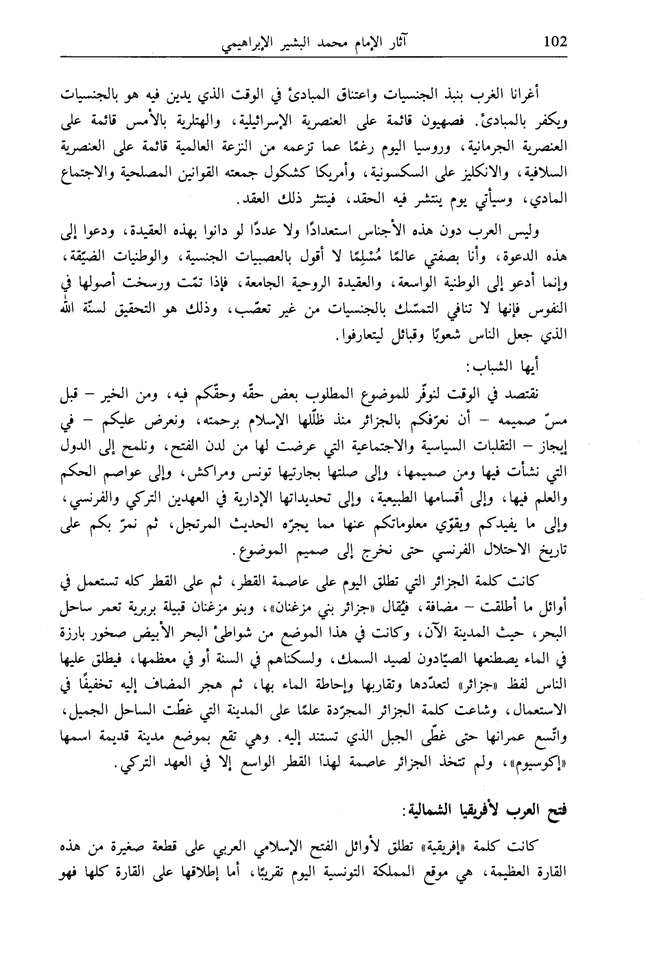 نقتصد في الوقت لنوفّر للموضوع المطلوب بعض حقّه وحقّكم فيه، ومن الخير- قبل مسّ صميمه- أن نعرّفكم بالجزائر منذ ظلّلها الإسلام برحمته، ونعرض عليكم- في إيجاز- التقلبات السياسية والاجتماعية التي عرضت لها من لدن الفتح، ونلمح إلى الدول التي نشأت فيها ومن صميمها، وإلى صلتها بجارتيها تونس ومراكش، وإلى عواصم الحكم والعلم فيها، وإلى أقسامها الطبيعية، وإلى تحديداتها الإدارية في العهدين التركي والفرنسي، وإلى ما يفيدكم ويقوّي معلوماتكم عنها مما يجرّه الحديث المرتجل، ثم نمرّ بكم على تاريخ الاحتلال الفرنسي حتى نخرج إلى صميم الموضوع.