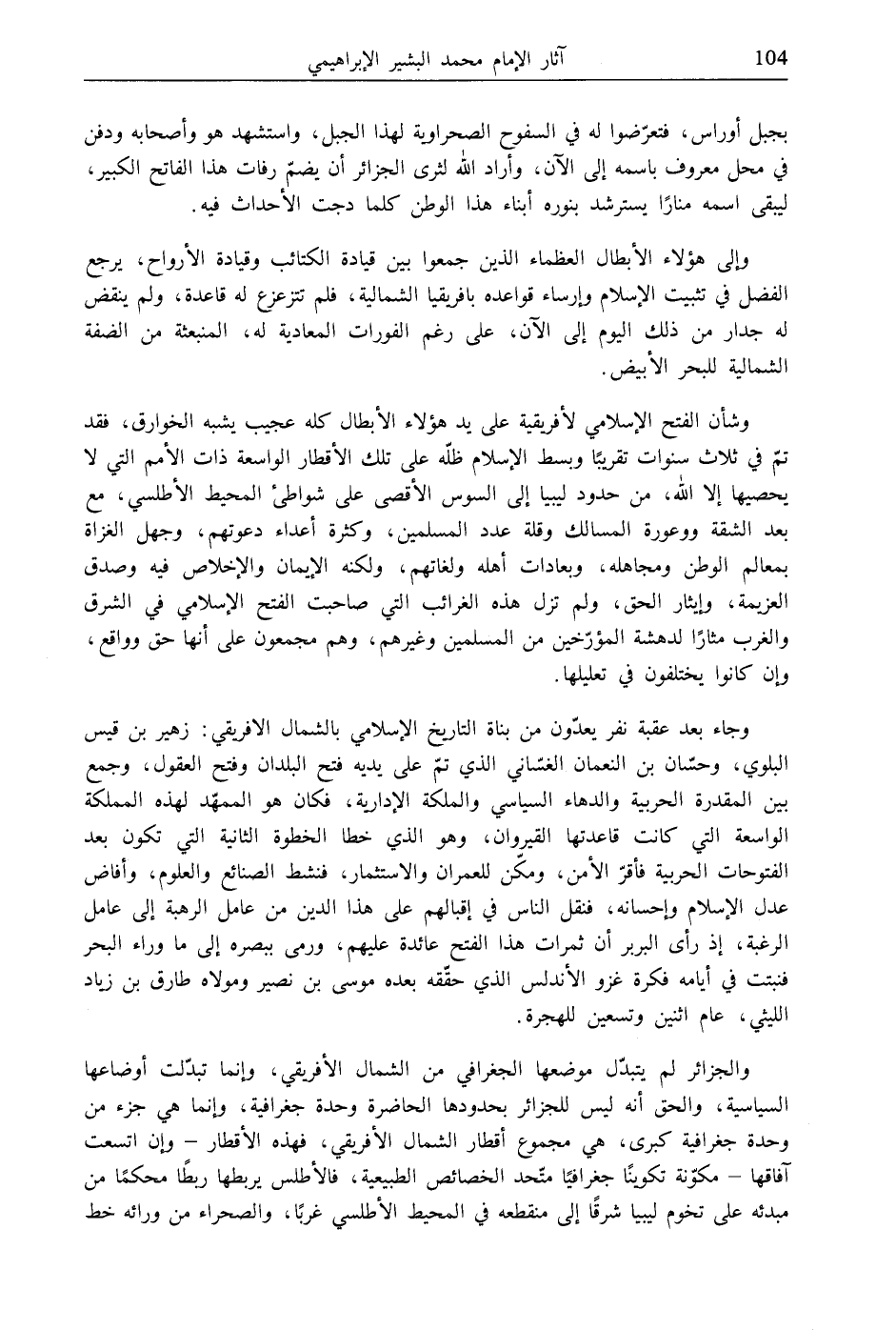 وإلى هؤلاء الأبطال العظماء الذين جمعوا بين قيادة الكتائب وقيادة الأرواح، يرجع الفضل في تثبيت الإسلام وإرساء قواعده بافريقيا الشمالية، فلم تتزعزع له قاعدة، ولم ينقض له جدار من ذلك اليوم إلى الآن، على رغم الفورات المعادية له، المنبعثة من الضفة الشمالية للبحر الأبيض.
