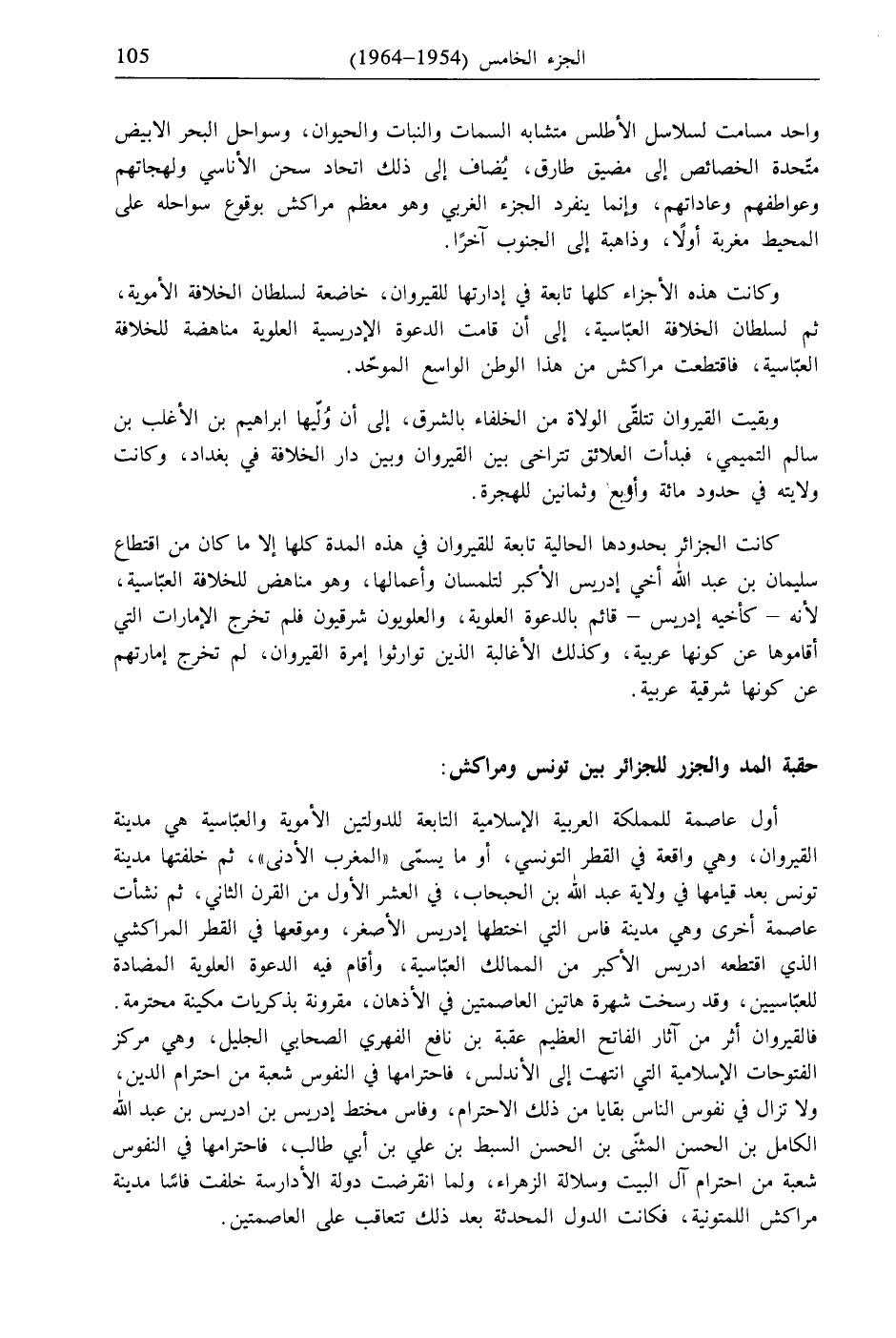 وكانت هذه الأجزاء كلها تابعة في إدارتها للقيروان، خاضعة لسلطان الخلافة الأموية، ثم لسلطان الخلافة العبّاسية، إلى أن قامت الدعوة الإدريسية العلوية مناهضة للخلافة العبّاسية، فاقتطعت مراكش من هذا الوطن الواسع الموحّد.