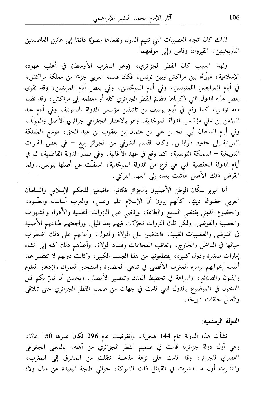 أما البربر سكّان الوطن الأصليون بالجزائر فكانوا خاضعين للحكم الإسلامي والسلطان العربي خضوعًا دينيًا، كأنهم يرون أن الإسلام علم وعمل، والعرب أساتذته ومعلّموه، والخضوع الديني يقتضي السمع والطاعة، ويقضي على النزوات النفسية والأهواء والشهوات والعصبية والفوضى. ولكن تلك النزوات تحرّكت فيهم بعد قليل. وراجعتهم طباعهم الأصلية في الفوضى والعصبيات القبلية، فانتقضوا على الولاة والدول، وأعانهم على ذلك اضطراب حبالها في الداخل والخارج، وتعاقب المجاعات وفساد الولاة، وأعذهم ذلك كله إلى إنشاء إمارات صغيرة ودول كبيرة، يقتطعونها من هذا الجسم الكبير، وكانت دولهم لا تقتصر عما أسّسه إخوانهم برابرة المغرب الأقصى في تناهي الحضارة واستبحار العمران وازدهار العلوم والفنون والصنائع، والبراعة في تخطيط المدن وتمصير الأمصار. ويحسن أن نمرّ بكم قبل الدخول في الموضوع بالدول التي قامت في جهات من صميم القطر الجزائري حتى تتلاقى وتتّصل حلقات تاريخه.
