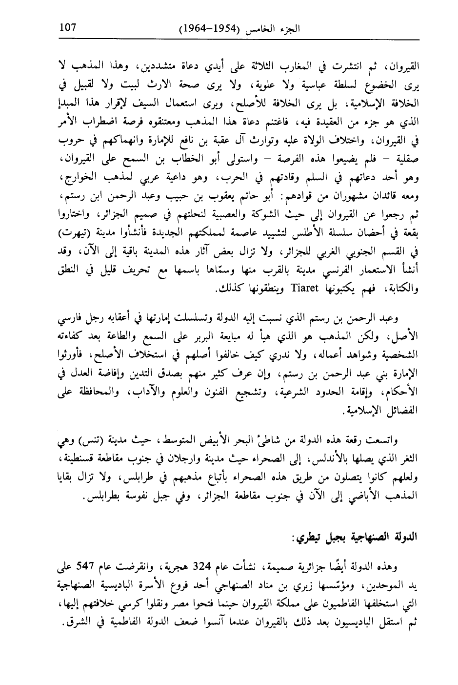 القيروان، ثم انتشرت في المغارب الثلاثة على أيدي دعاة متشددين، وهذا المذهب لا يرى الخضوع لسلطة عباسية ولا علوية، ولا يرى صحة الإرث لبيت ولا لقبيل في الخلافة الإسلامية، بل يرى الخلافة للأصلح، ويرى استعمال السيف لإقرار هذا المبدإ الذي هو جزء من العقيدة فيه، فاغتنم دعاة هذا المذهب ومعتنقوه فرصة اضطراب الأمر في القيروان، واختلاف الولاة عليه وتوارث آل عقبة بن نافع للإمارة وانهماكهم في حروب صقلية- فلم يضيعوا هذه الفرصة- واستولى أبو الخطاب بن السمح على القيروان، وهو أحد دعاتهم في السلم وقادتهم في الحرب، وهو داعية عربي لمذهب الخوارج، ومعه قائدان مشهوران من قوادهم: أبو حاتم يعقوب بن حبيب وعبد الرحمن ابن رستم، ثم رجعوا عن القيروان إلى حيث الشوكة والعصبية لنحلتهم في صميم الجزائر، واختاروا بقعة في أحضان سلسلة الأطلس لتشييد عاصمة لمملكتهم الجديدة فأنشأوا مدينة (تيهرت) في القسم الجنوبي الغربي للجزائر، ولا تزال بعض آثار هذه المدينة باقية إلى الآن، وقد أنشأ الاستعمار الفرنسي مدينة بالقرب منها وسمّاها باسمها مع تحريف قليل في النطق والكتابة، فهم يكتبونها Tiaret وينطقونها كذلك.