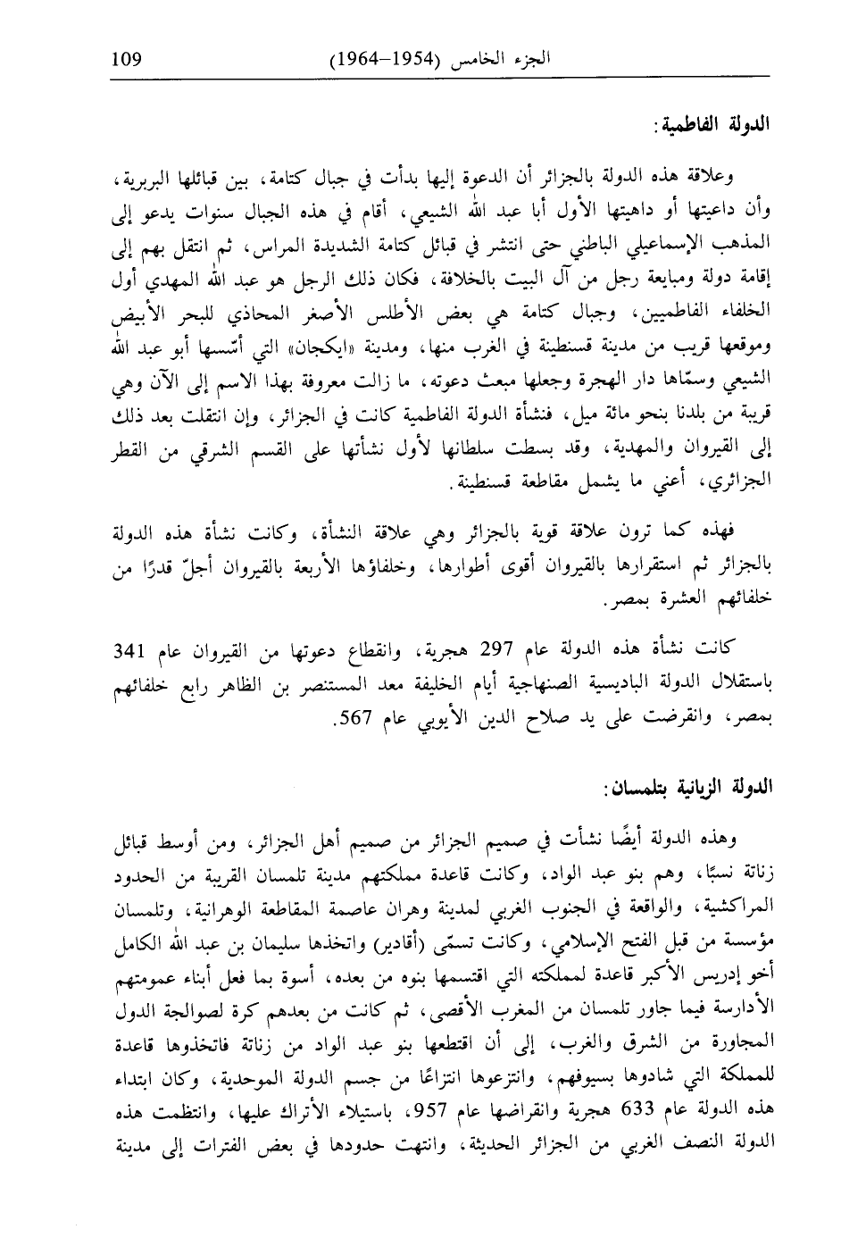 وعلاقة هذه الدولة بالجزائر أن الدعوة إليها بدأت في جبال كتامة، بين قبائلها البربرية، وأن داعيتها أو داهيتها الأول أبا عبد الله الشيعي، أقام في هذه الجبال سنوات يدعو إلى المذهب الإسماعيلي الباطني حتى انتشر في قبائل كتامة الشديدة المراس، ثم انتقل بهم إلى إقامة دولة ومبايعة رجل من آل البيت بالخلافة، فكان ذلك الرجل هو عبد الله المهدي أول الخلفاء الفاطميين، وجبال كتامة هي بعض الأطلس الأصغر المحاذي للبحر الأبيض وموقعها قريب من مدينة قسنطينة في الغرب منها، ومدينة "ايكجان" التي أسّسها أبو عبد الله الشيعي وسمّاها دار الهجرة وجعلها مبعث دعوته، ما زالت معروفة بهذا الاسم إلى الآن وهي قريبة من بلدنا بنحو مائة ميل، فنشأة الدولة الفاطمية كانت في الجزائر، وإن انتقلت بعد ذلك إلى القيروان والمهدية، وقد بسطت سلطانها لأول نشأتها على القسم الشرقي من القطر الجزائري، أعني ما يشمل مقاطعة قسنطينة.