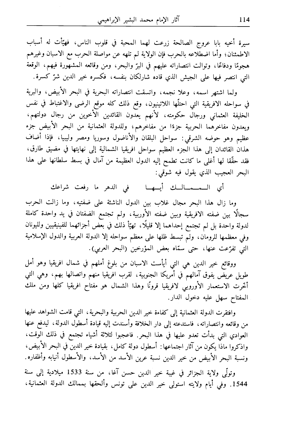 ووقائع خير الدين هي التي أيأست الإسبان من بلوغ أملهم في شمال افريقيا وهو أمل طويل عريض يفوق آمالهم في أمريكا الجنوبية، لقرب افريقيا منهم واتصالها بهم، وهي التي أخّرت الاستعمار الأوروبي لافريقيا قرونًا وهذا الشمال هو مفتاح افريقيا كلها ومن ملك المفتاح سهل عليه دخول الدار.