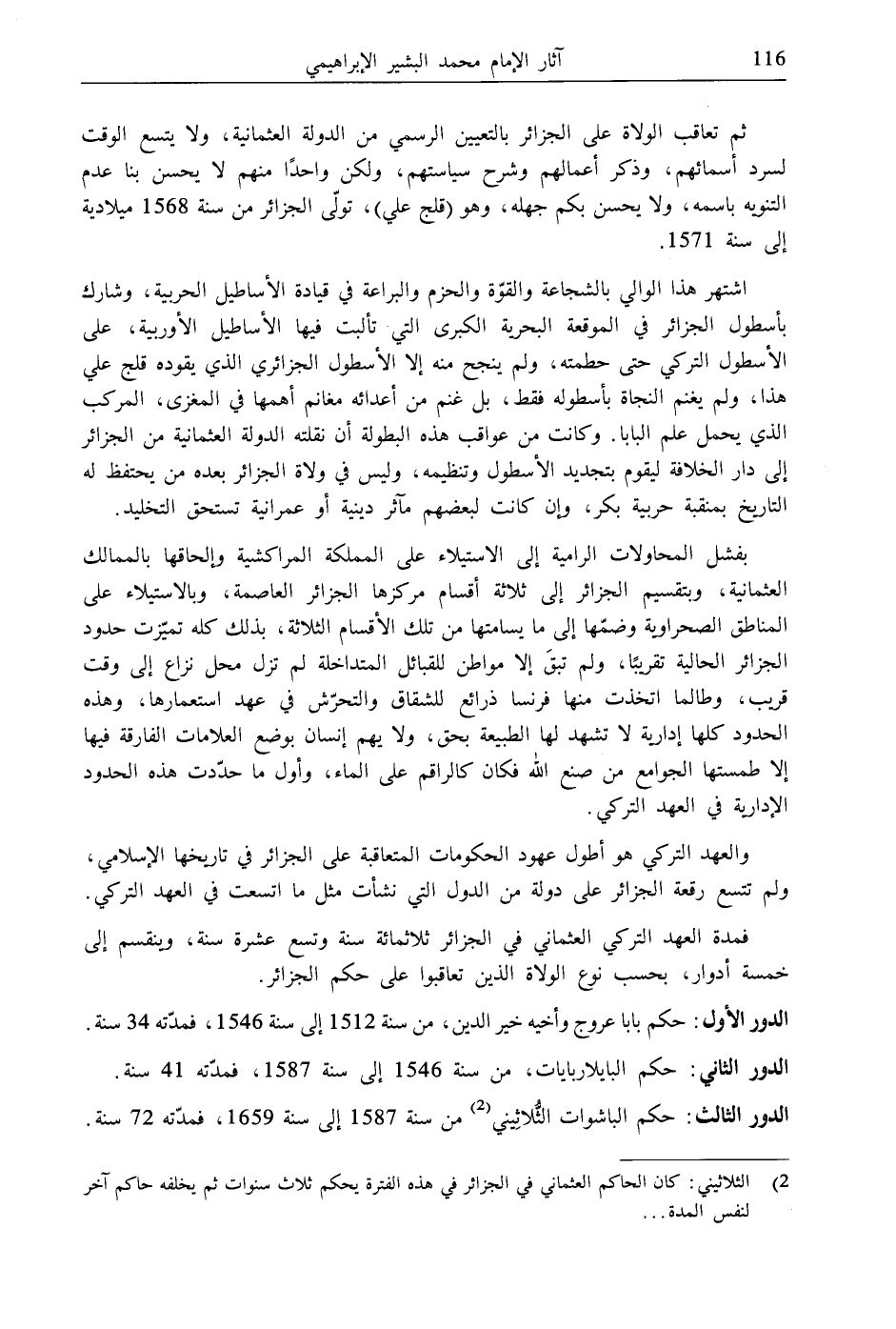 بفشل المحاولات الرامية إلى الاستيلاء على المملكة المراكشية وإلحاقها بالممالك العثمانية، وبتقسيم الجزائر إلى ثلاثة أقسام مركزها الجزائر العاصمة، وبالاستيلاء على المناطق الصحراوية وضمّها إلى ما يسامتها من تلك الأقسام الثلاثة، بذلك كله تميّزت حدود الجزائر الحالية تقريبًا، ولم تبقَ إلا مواطن للقبائل المتداخلة لم تزل محل نزاع إلى وقت قريب، وطالما اتخذت منها فرنسا ذرائع للشقاق والتحرّش في عهد استعمارها، وهذه الحدود كلها إدارية لا تشهد لها الطبيعة بحق، ولا يهم إنسان بوضع العلامات الفارقة فيها إلا طمستها الجوامع من صنع الله فكان كالراقم على الماء، وأول ما حدّدت هذه الحدود الإدارية في العهد التركي.
