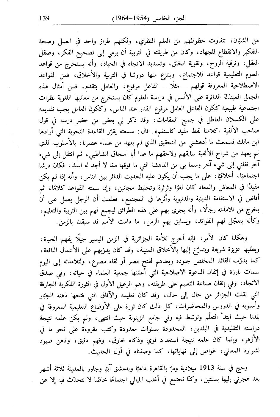 وهكذا كان الأمر، فإنه أخرج للأمة الجزائرية في الزمن اليسير جيلًا يفهم الحياة، ويطلبها عزيزة شريفة ويتدرعّ إليها بالأخلاق المتينة، وقد كان يدرّبهم على الأعمال النافعة، كما يدرّب القائد المخلص جنوده ويعدهم لفتح مصر أو لقاء مصرع، ولتلامذته إلى اليوم سمات بارزة في إتقان الدعوة الاصلاحية التي أعلنتها جمعية العلماء في حياته، وفي صدق الاتجاه، وفي إتقان صناعة التعليم على طريقته، وهم الرعيل الأول في الثورة الفكرية الجارفة التي نقلت الجزائر من حال إلى حال، وقد كان تعليمه والآفاق التي فتحها ذهنه الجبّار وأسلوبه في الدروس والمحاضرات، كل ذلك كان ثورة على الأوضاع التعليمية المعروفة في بلدنا حيث ابتدأ التعلّم وتوسّط فيه وفي جامع الزيتونة حيث انتهى، ولم يكن علمه نتيجة دراسته التقليدية في البلدين، المحدودة بسنوات معدودة وكتب مقروءة على نحو ما في الأزهر، وإنما كان علمه نتيجة استعداد قوي وذكاء خارق، وفهم دقيق، وذهن صيود لشوارد المعاني، غواص إلى نهاياتها، كما وصفناه في أول الحديث.