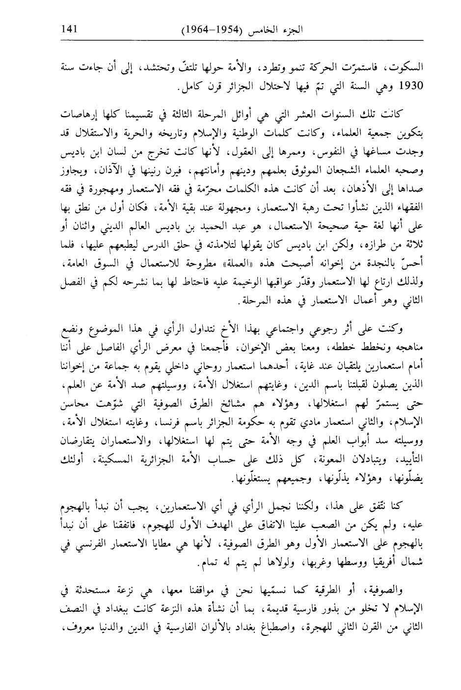 كانت تلك السنوات العشر التي هي أوائل المرحلة الثالثة في تقسيمنا كلها إرهاصات بتكوين جمعية العلماء، وكانت كلمات الوطنية والإسلام وتاريخه والحرية والاستقلال قد وجدت مساغها في النفوس، وممرها إلى العقول، لأنها كانت تخرج من لسان ابن باديس وصحبه العلماء الشجعان الموثوق بعلمهم ودينهم وأمانتهم، فيرن رنينها في الآذان، ويجاوز صداها إلى الأذهان، بعد أن كانت هذه الكلمات محرّمة في فقه الاستعمار ومهجورة في فقه الفقهاء الذين نشأوا تحت رهبة الاستعمار، ومجهولة عند بقية الأمة، فكان أول من نطق بها على أنها لغة حية صحيحة الاستعمال، هو عبد الحميد بن باديس العالم الديني واثنان أو ثلاثة من طرازه، ولكن ابن باديس كان يقولها لتلامذته في حلق الدرس ليطبعهم عليها، فلما أحسّ بالنجدة من إخوانه أصبحت هذه "العملة" مطروحة للاستعمال في السوق العامة، ولذلك ارتاع لها الاستعمار وقدّر عواقبها الوخيمة عليه فاحتاط لها بما نشرحه لكم في الفصل الثاني وهو أعمال الاستعمار في هذه المرحلة.