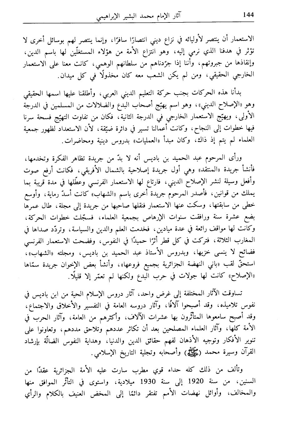 تساوقت الآثار المختلفة إلى غرض واحد، آثار دروس الإسلام الحية من ابن باديس في نفوس تلاميذه، وقد أصبحوا آلافًا، وآثار دروسه العامة في التفسير والأخلاق والاجتماع، وقد أصبح سامعوها المتأثّرون بها عشرات الآلاف، وأكثرهم من العامة، وآثار الحرب في الأمة كلها، وآثار العلماء المصلحين بعد أن تكاثر عددهم وتلاحق مددهم، وتعاونوا على تنوير الأفكار وتوجيه الأذهان لفهم حقائق الدين والدنيا، وهداية النفوس الضالّة بإرشاد القرآن وسيرة محمد - صلى الله عليه وسلم - وأصحابه وتجلية التاريخ الإسلامي.