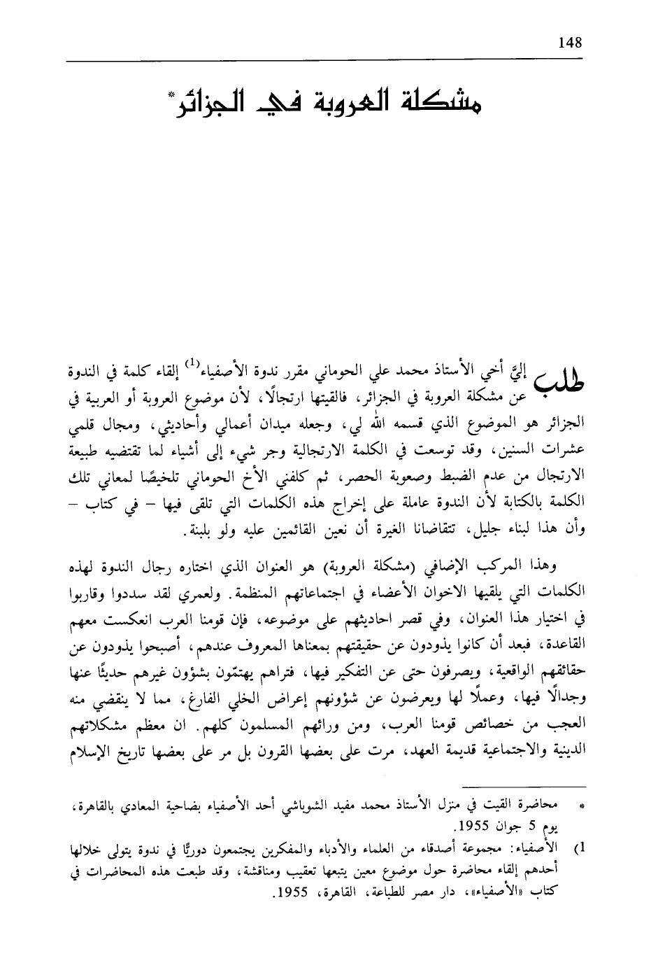 طلب إليَّ أخي الأستاذ محمد علي الحوماني مقرر ندوة الأصفياء (1) إلقاء كلمة في الندوة. عن مشكلة العروبة في الجزائر، فالقيتها ارتجالًا، لأن موضوع العروبة أو العربية في الجزائر هو الموضوع الذي قسمه الله لي، وجعله ميدان أعمالي وأحاديثي، ومجال قلمي عشرات السنين، وقد توسعت في الكلمة الارتجالية وجر شيء إلى أشياء لما تقتضيه طبيعة الارتجال من عدم الضبط وصعوبة الحصر، ثم كلفني الأخ الحوماني تلخيصًا لمعاني تلك الكلمة بالكتابة لأن الندوة عاملة على إخراج هذه الكلمات التي تلقى فيها- في كتاب- وأن هذا لبناء جليل، تتقاضانا الغيرة أن نعين القائمين عليه ولو بلبنة.