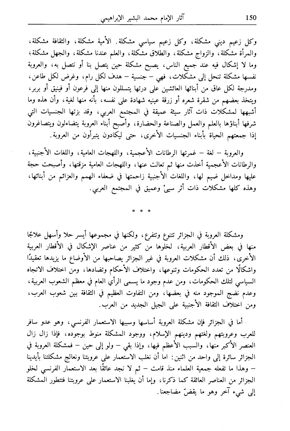 أما في الجزائر فإن مشكلة العروبة أساسها وسببها الاستعمار الفرنسي، وهو عدو سافر للعرب وعروبتهم ولغتهم ودينهم الإسلام، ووجود المشكلة منوط بوجوده، فإذا زال زال العنصر الأكبر منها، والسبب الأعظم فيها، وإذا بقي- ولو إلى حين- فمشكلة العروبة في الجزائر سائرة إلى واحد من اثنين: إما أن نغلب الاستعمار على عروبتنا ونعالج مشكلتنا بأيدينا - وهذا ما تفعله جمعية العلماء منذ قامت- ثم لا نجد عائقًا بعد الاستعمار الفرنسي لخلو الجزائر من العناصر العائقة كما ذكرنا، وإما أن يغلبنا الاستعمار على عروبتنا فتتطور المشكلة إلى شيءآخر وهو ما يقضّ مضاجعنا.