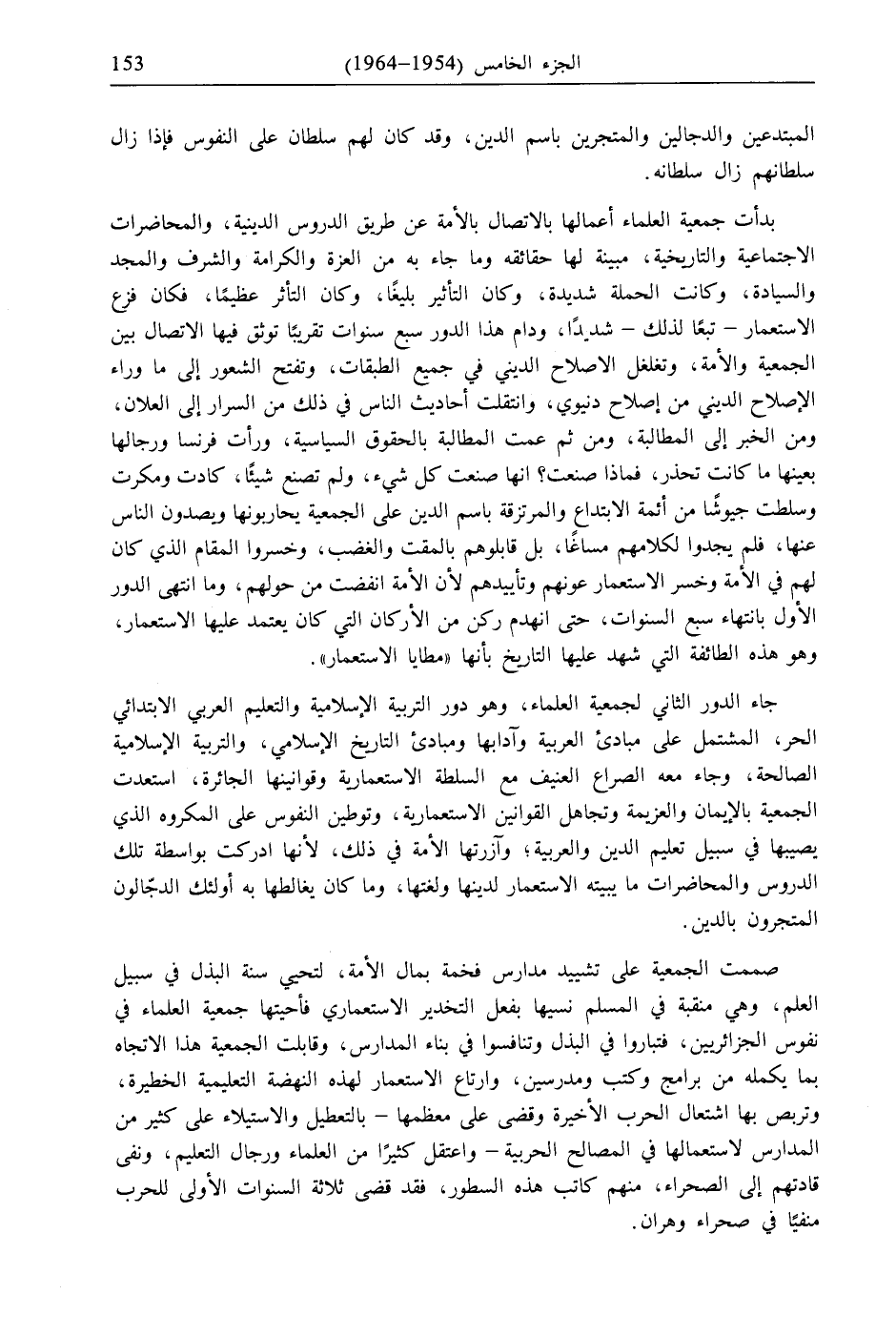 جاء الدور الثاني لجمعية العلماء، وهو دور التربية الإسلامية والتعليم العربي الابتدائي الحر، المشتمل على مبادئ العربية وآدابها ومبادئ التاريخ الإسلامي، والتربية الإسلامية الصالحة، وجاء معه الصراع العنيف مع السلطة الاستعمارية وقوانينها الجائرة، استعدت الجمعية بالإيمان والعزيمة وتجاهل القوانين الاستعمارية، وتوطين النفوس على المكروه الذي يصيبها في سبيل تعليم الدين والعربية، وآزرتها الأمة في ذلك، لأنها أدركت بواسطة تلك الدروس والمحاضرات ما يبيته الاستعمار لدينها ولغتها، وما كان يغالطها به أولئك الدجّالون المتجرون بالدين.