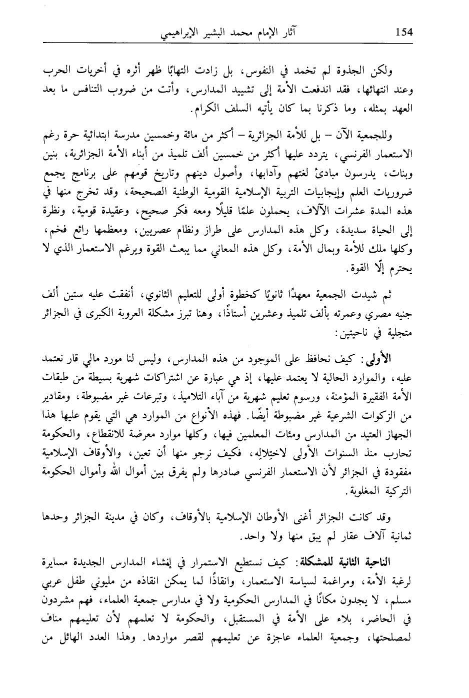 الأولى: كيف نحافظ على الموجود من هذه المدارس، وليس لنا مورد مالي قار نعتمد عليه، والموارد الحالية لا يعتمد عليها، إذ هي عبارة عن اشتراكات شهرية بسيطة من طبقات الأمة الفقيرة المؤمنة، ورسوم تعليم شهرية من آباء التلاميذ، وتبرعات غير مضبوطة، ومقادير من الزكوات الشرعية غير مضبوطة أيضًا. فهذه الأنواع من الموارد هي التي يقوم عليها هذا الجهاز العتيد من المدارس ومئات المعلمين فيها، وكلها موارد معرضة للانقطاع، والحكومة تحارب منذ السنوات الأولى لاختِلالِه، فكيف نرجو منها أن تعين، والأوقاف الإسلامية مفقودة في الجزائر لأن الاستعمار الفرنسي صادرها ولم يفرق بين أموال الله وأموال الحكومة التركية المغلوبة.