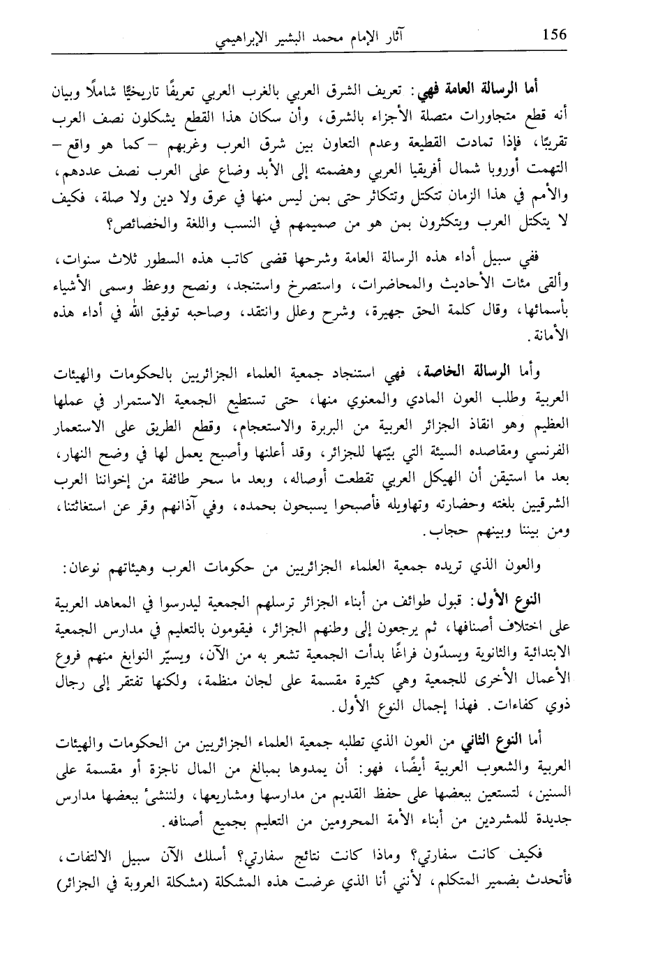وأما ـ[الرسالة الخاصة]ـ، فهي استنجاد جمعية العلماء الجزائريين بالحكومات والهيئات العربية وطلب العون المادي والمعنوي منها، حتى تستطيع الجمعية الاستمرار في عملها العظيم وهو إنقاذ الجزائر العربية من البربرة والاستعجام، وقطع الطريق على الاستعمار الفرنسي ومقاصده السيئة التي بيّتها للجزائر، وقد أعلنها وأصبح يعمل لها في وضح النهار، بعد ما استيقن أن الهيكل العربي تقطعت أوصاله، وبعد ما سحر طائفة من إخواننا العرب الشرقيين بلغته وحضارته وتهاويله فأصبحوا يسبحون بحمده، وفي آذانهم وقر عن استغاثتنا، ومن بيننا وبينهم حجاب.