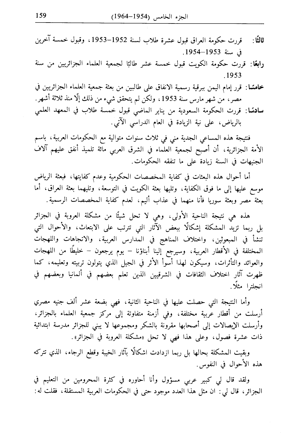 رابعًا: قررت حكومة الكويت قبول خمسة عشر طالبًا لجمعية العلماء الجزائريين من سنة 1953.