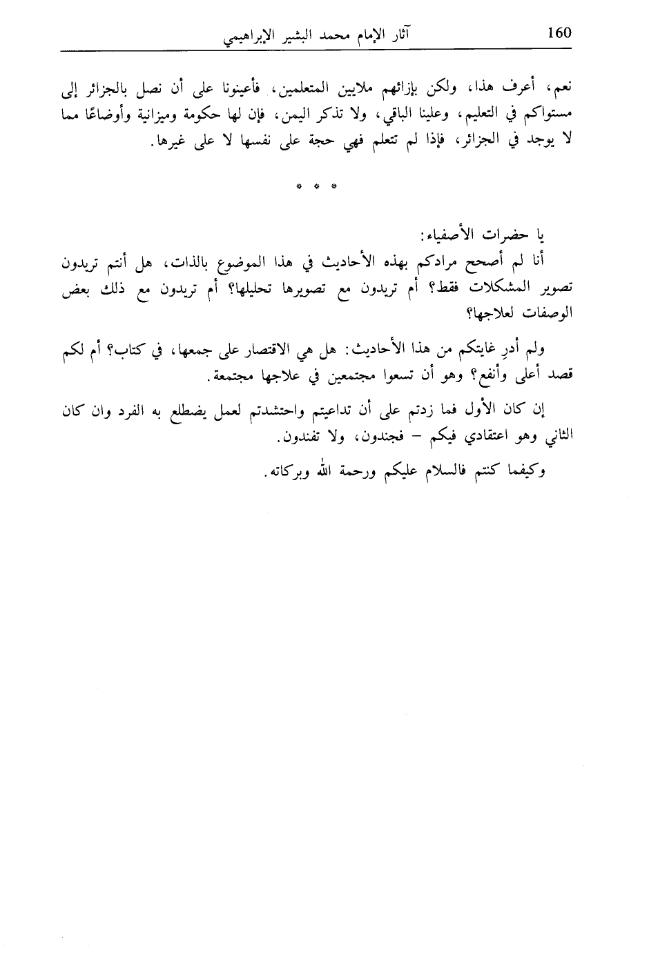نعم، أعرف هذا، ولكن بإزائهم ملايين المتعلمين، فأعينونا على أن نصل بالجزائر إلى مستواكم في التعليم، وعلينا الباقي، ولا تذكر اليمن، فإن لها حكومة وميزانية وأوضاعًا مما لا يوجد في الجزائر، فإذا لم تتعلم فهي حجة على نفسها لا على غيرها.